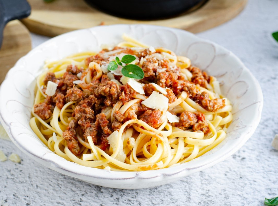Pasta en salsa de tomate con carne molida y especias italianas.