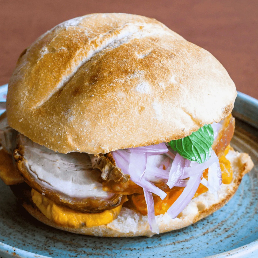 Pan suave con chicharrón crocante, camote frito y salsa criolla.