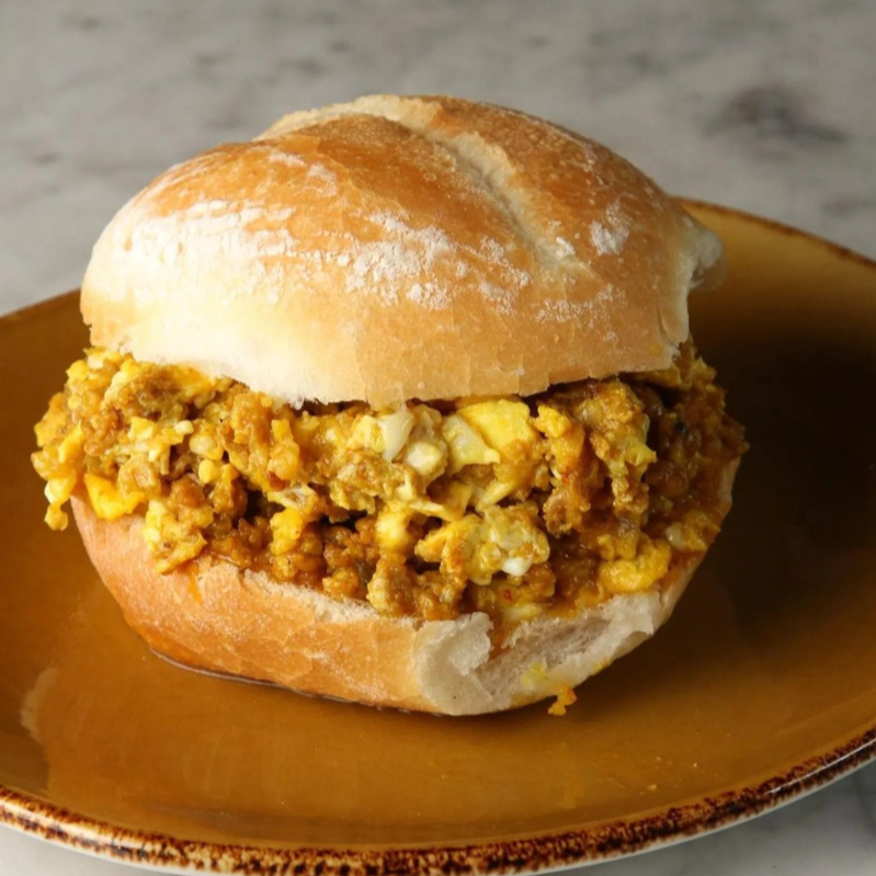 Pan calientito con salchicha huachana dorada, huevo y pan recién tostado.