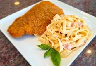 Pasta cremosa con salsa blanca, queso parmesano con pollo mechado, 250 g de milanesa de pollo a la plancha.