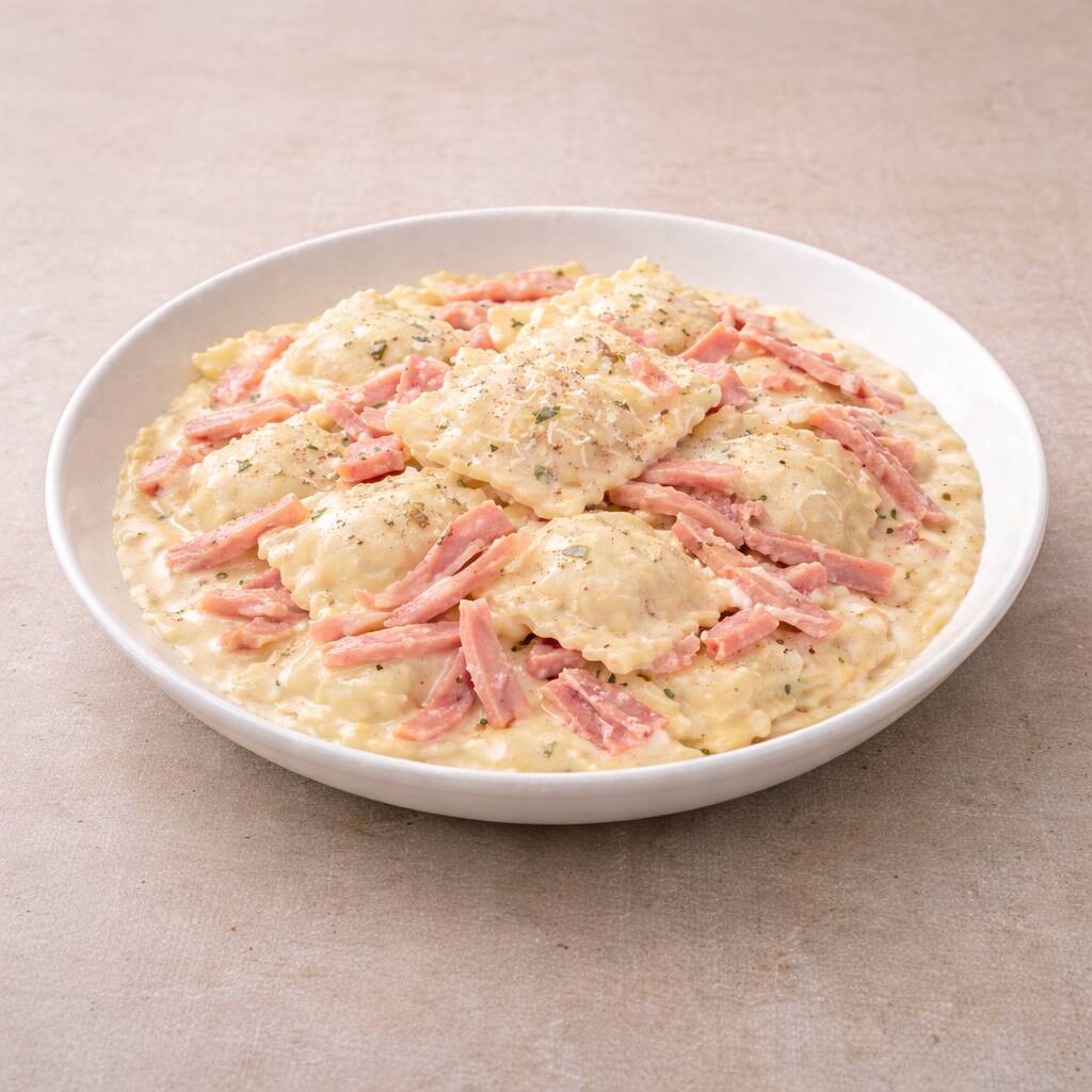 Plato de ravioles acompañado de salsa blanca y pedacitos de jamón.