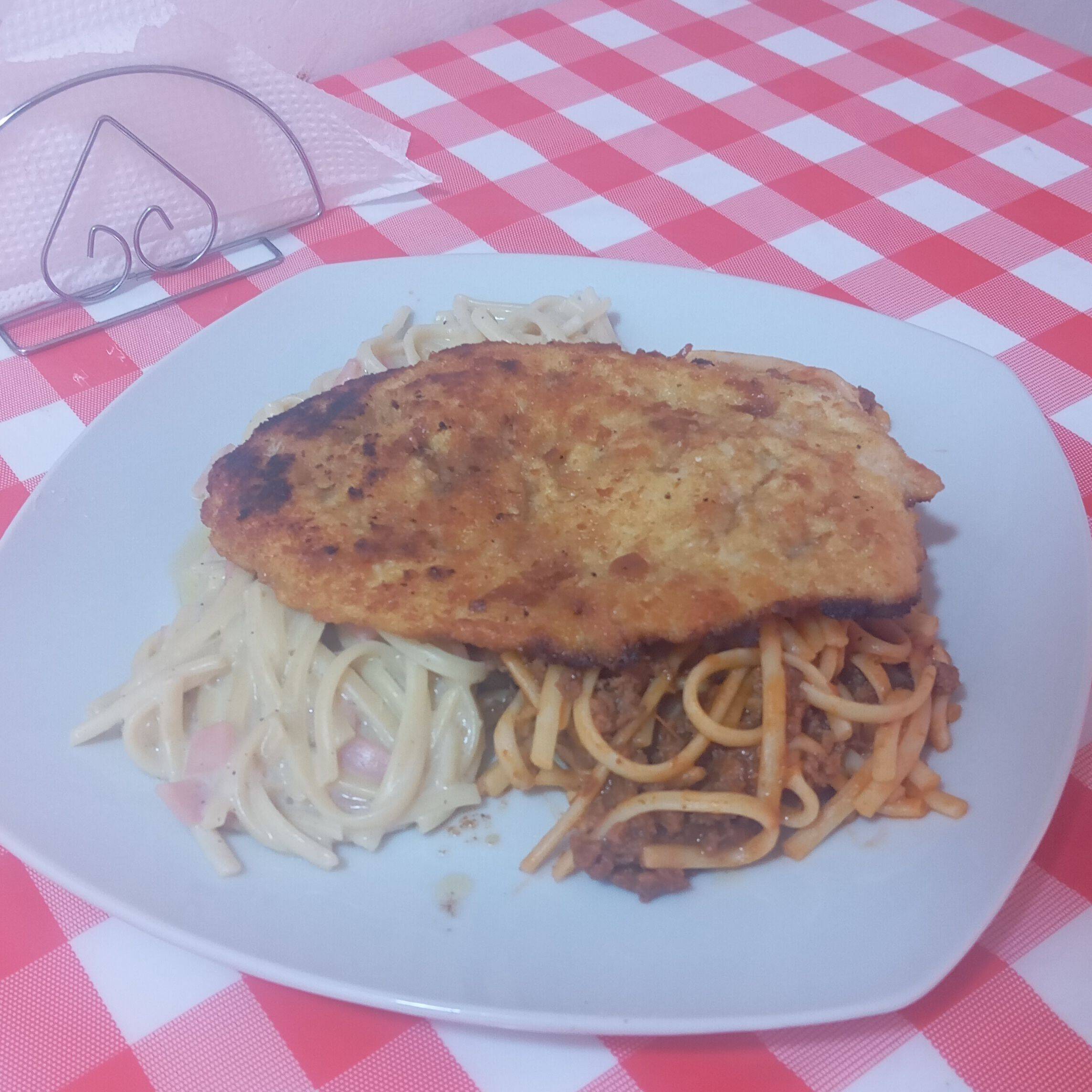 Tubo de pasta Alfredo y boloñesa acompañado con milanesa de pollo.
