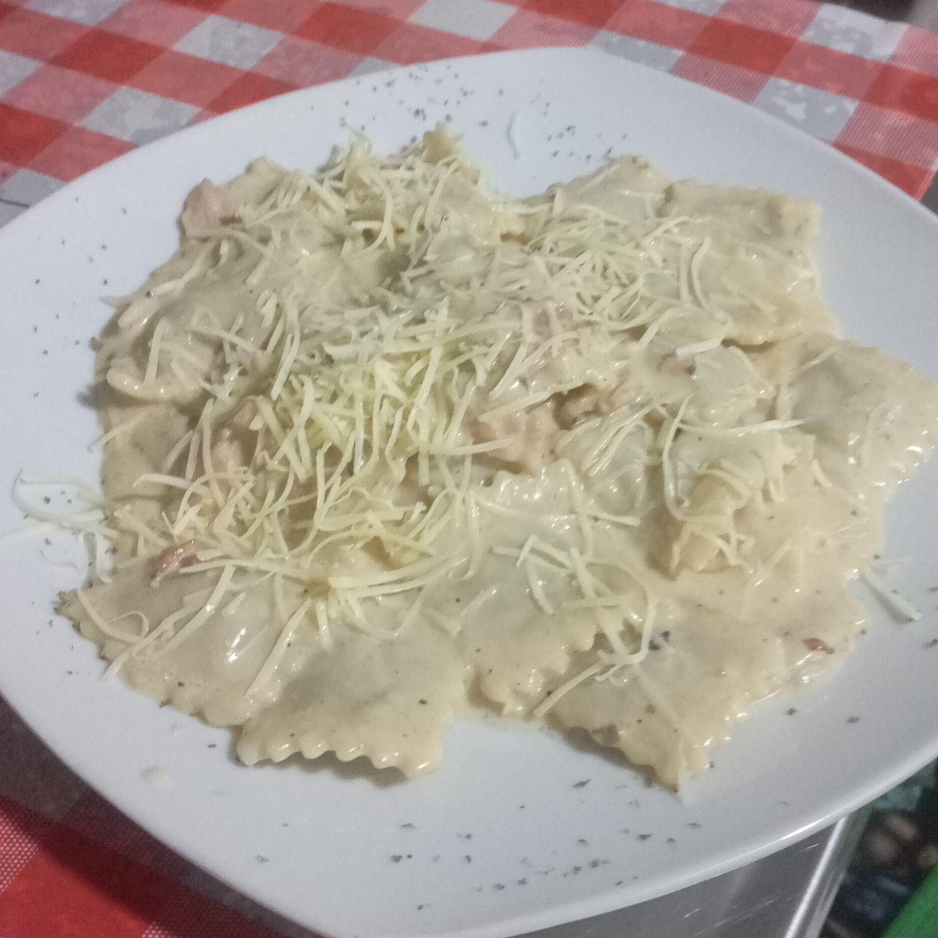 Plato de ravioles carbonara con su salsa blanca de la casa con tocineta, preparado al momento, no te lo pierdas.