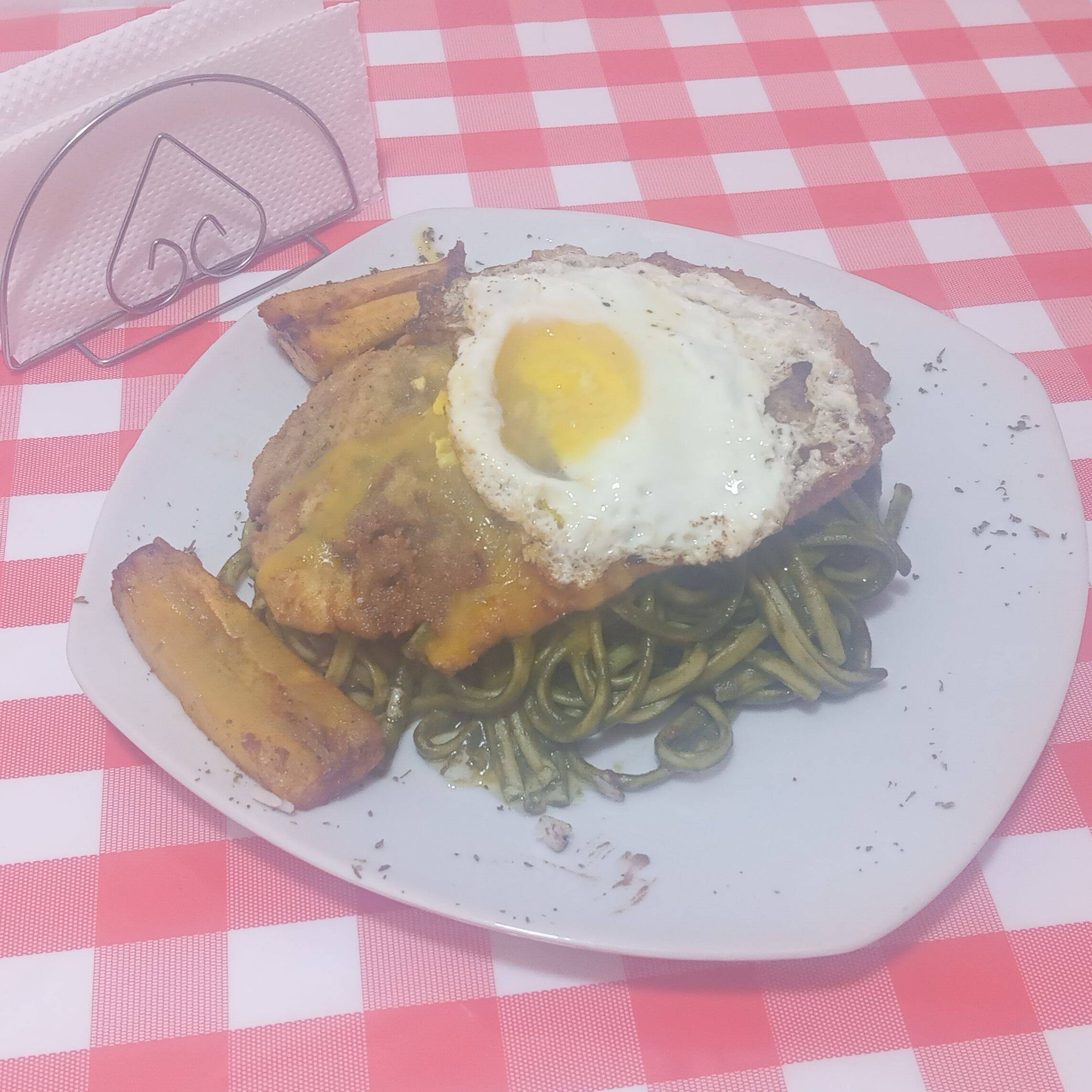 Tallarín Verde con Miilanesa a Lo Pobre.