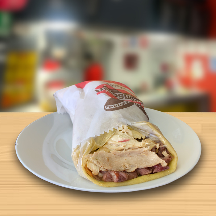 Pan, lechón, pollo deshilachado, ensalada, papas al hilo y cremas a elección.