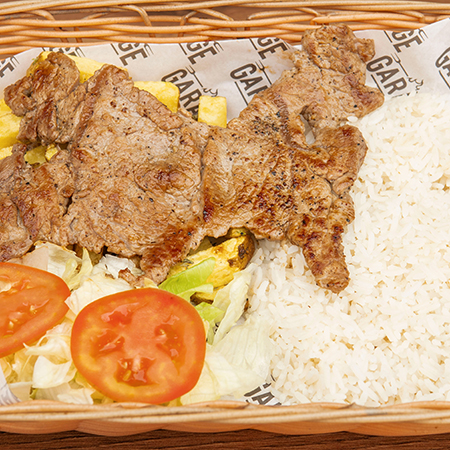 Churrasco de res de 120gr + papas amarillas + arroz blanco + ensalada