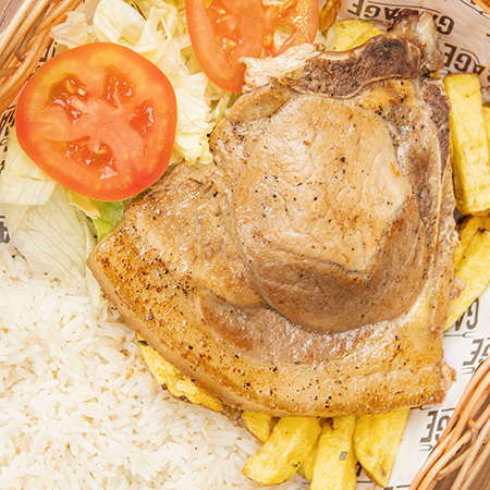 Chuleta de cerdo a la plancha + papas amarillas + arroz blanco + ensalada