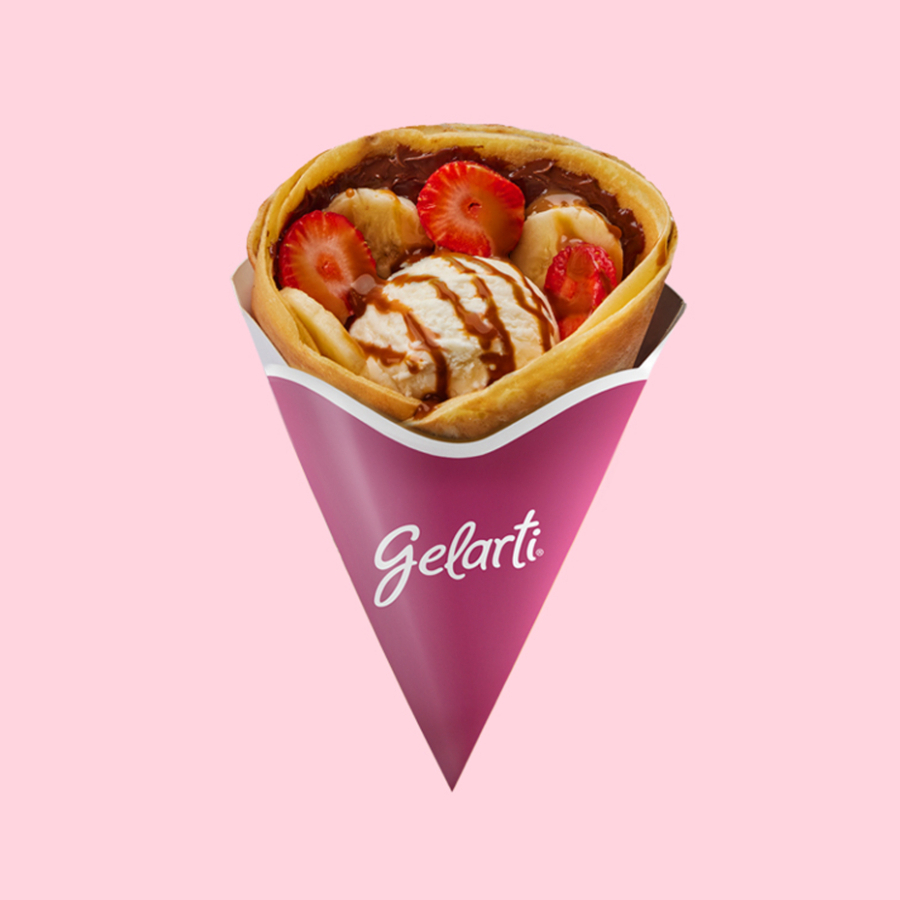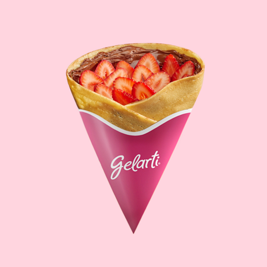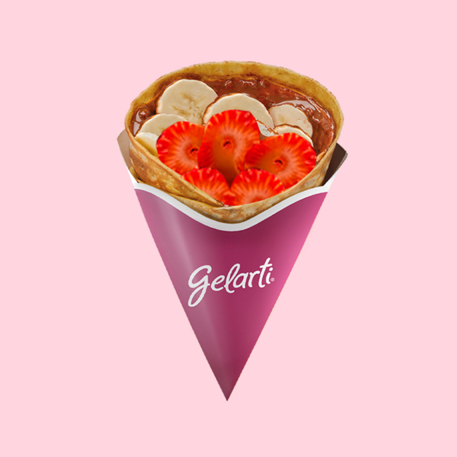 Crepe de nutella, relleno con fresa, plátano y una bola de helado a elección entre 29 deliciosos sabores.
