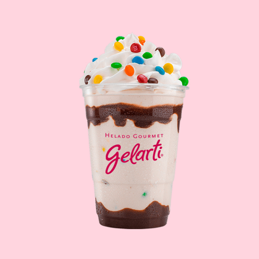 Combinamos helado de mm's, leche deslactosada, decorado con salsa de chocolate, chantilly y mm's.