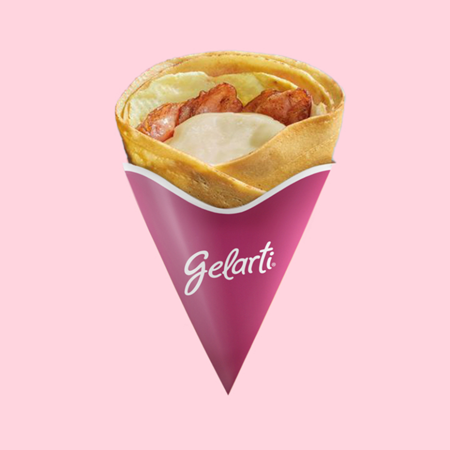 Crepe relleno con huevo, queso gouda y tocino.