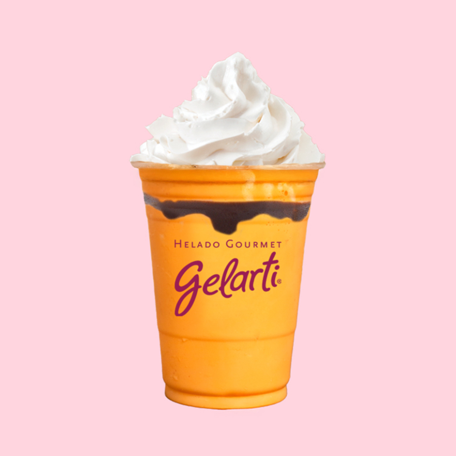 Combinamos helado de mandarina, leche deslactosada, decorado con salsa de caramelo y chantilly.