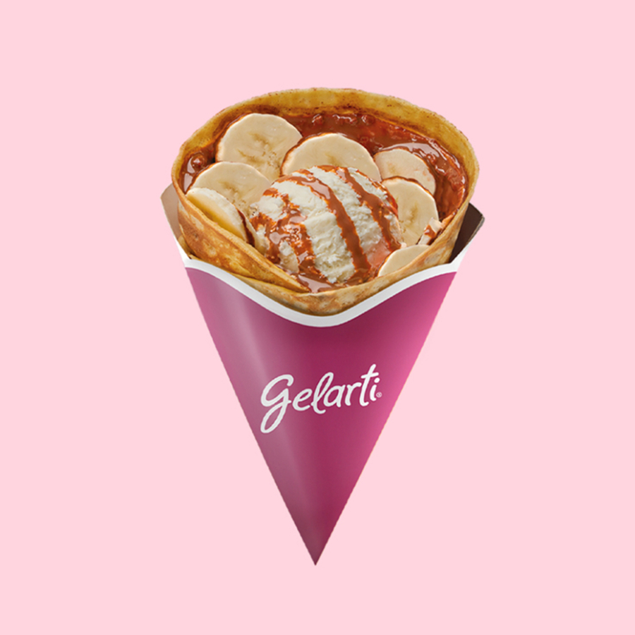 Crepe de manjar, relleno con fresa o plátano y una bola de helado a elección entre 29 deliciosos sabores.