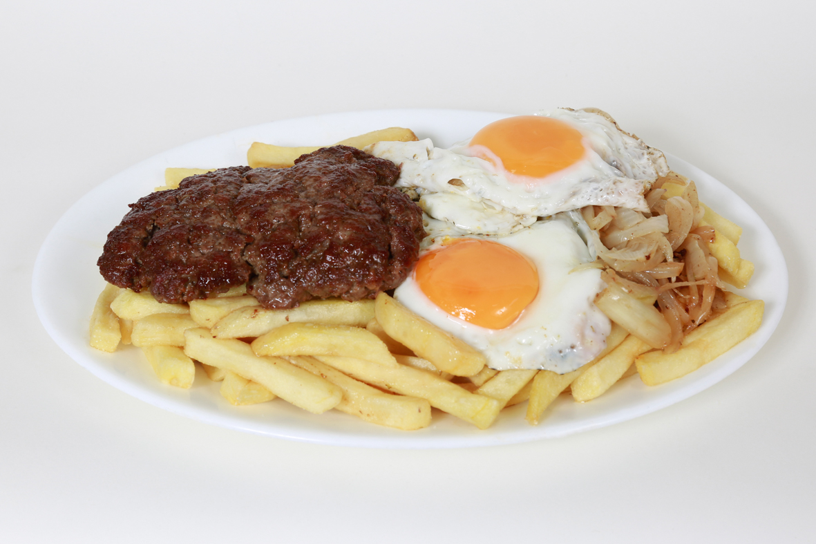 Carne de hamburguesa, arroz, papas, huevo y plátano.