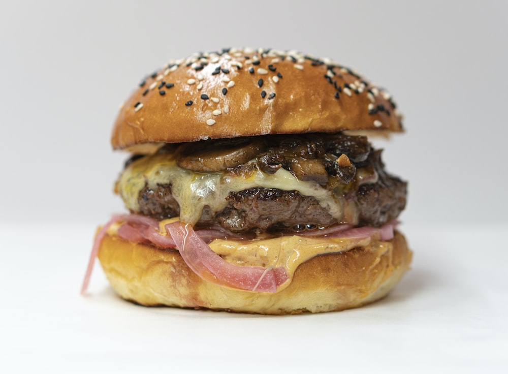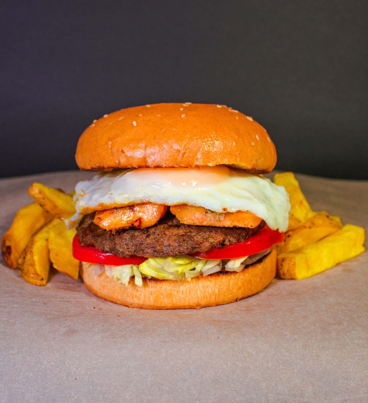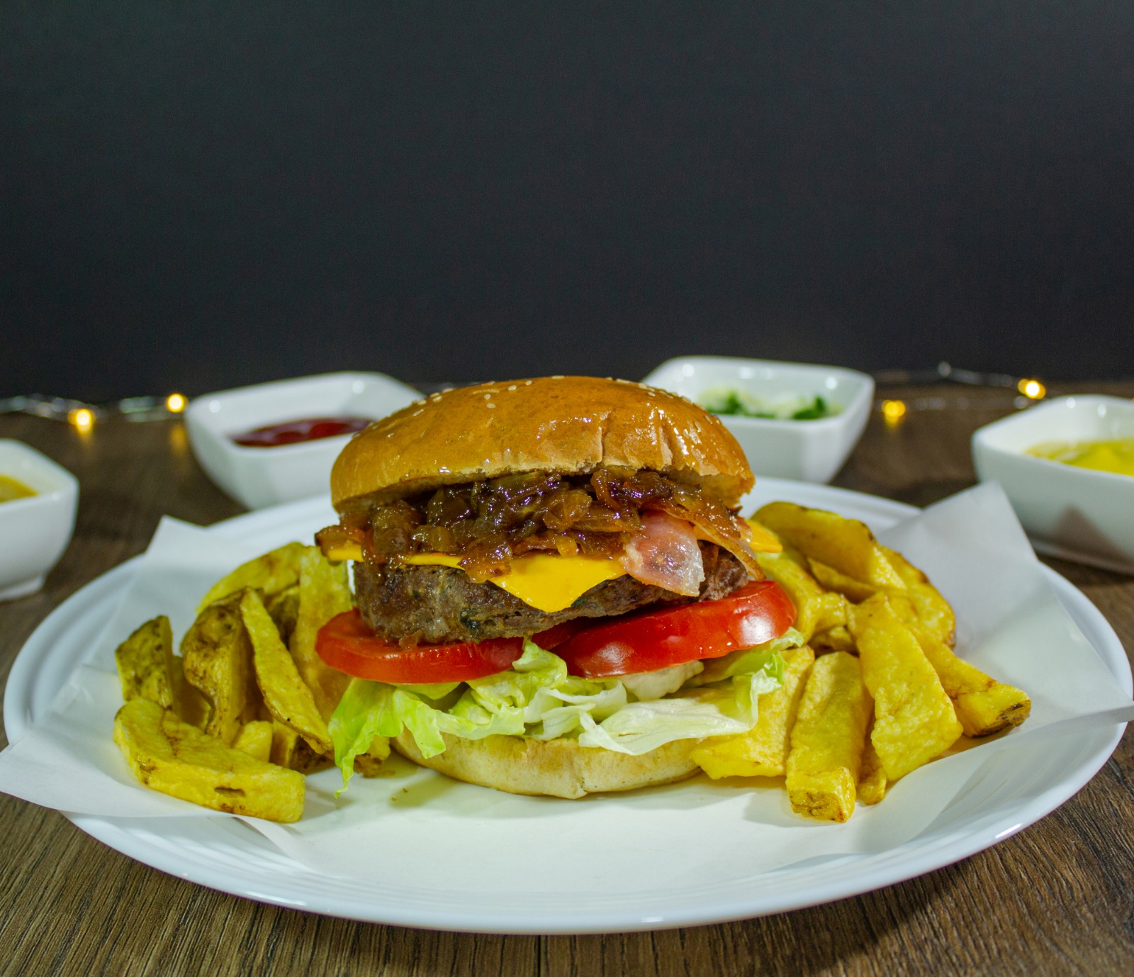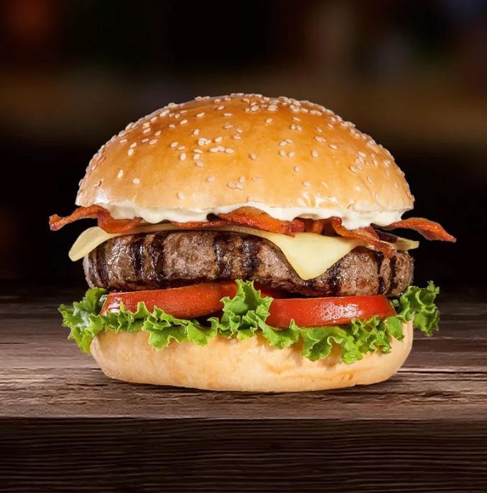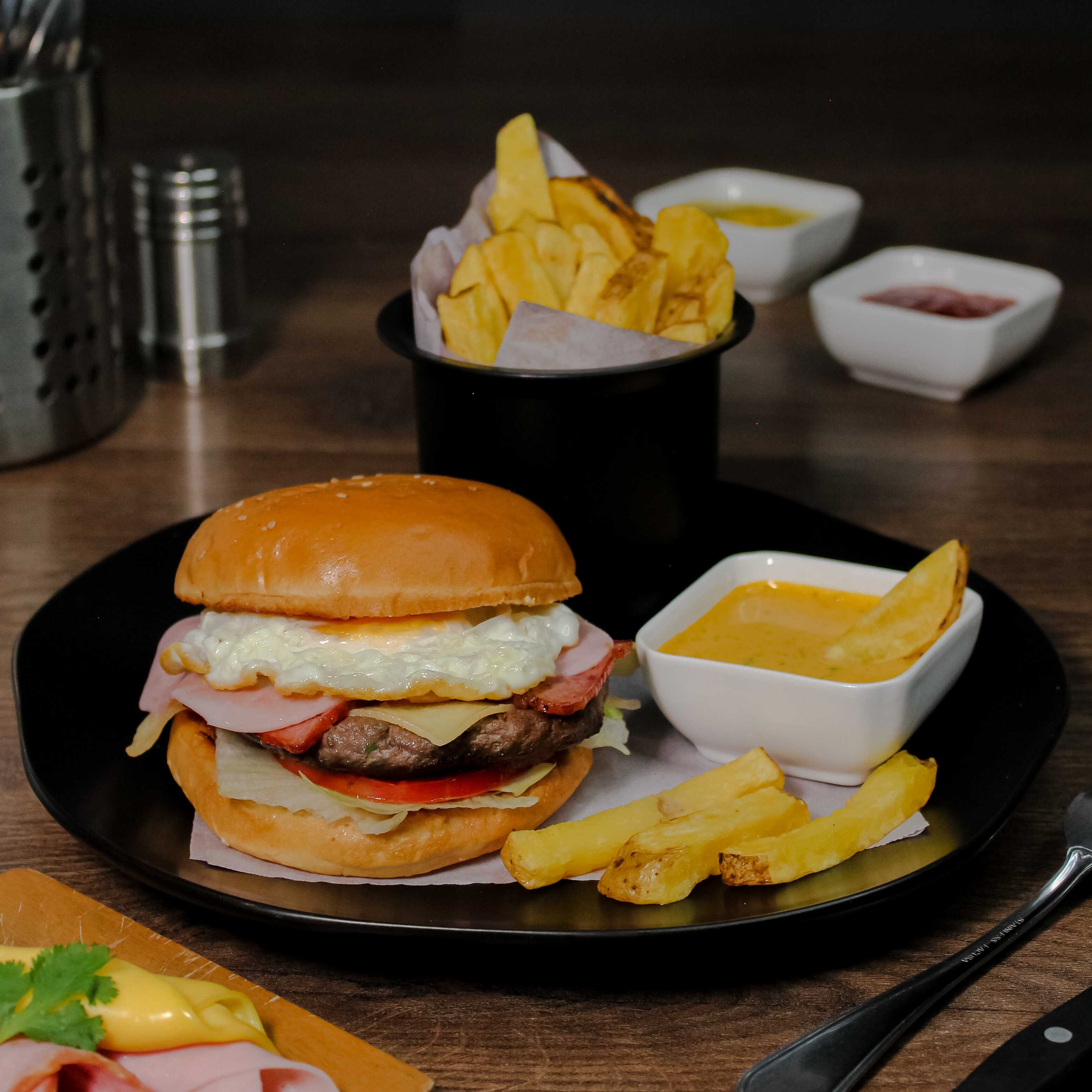 Hamburguesa, queso, huevo, jamón y tocino.