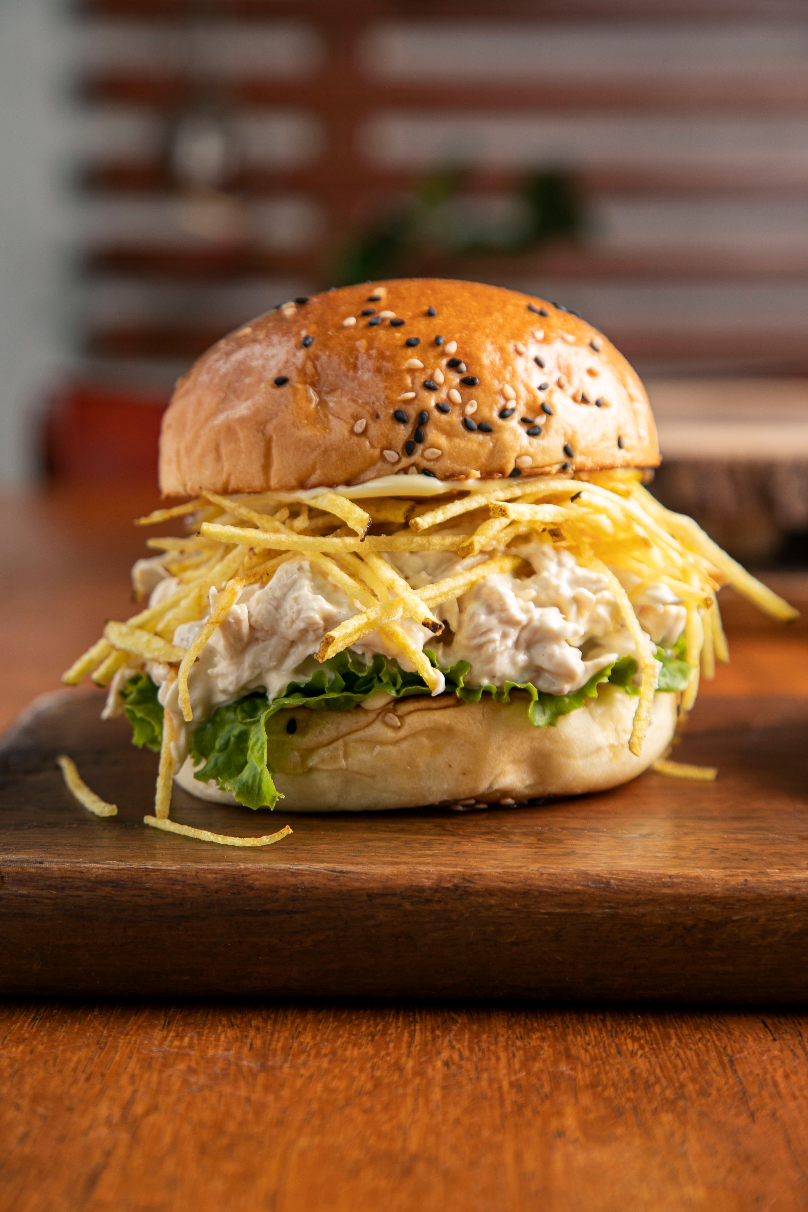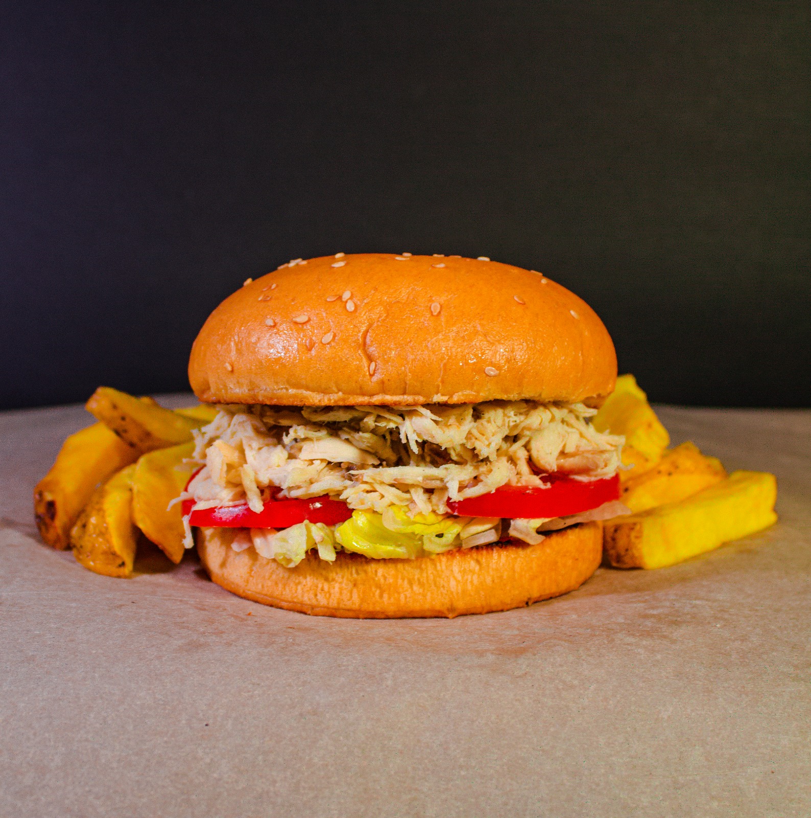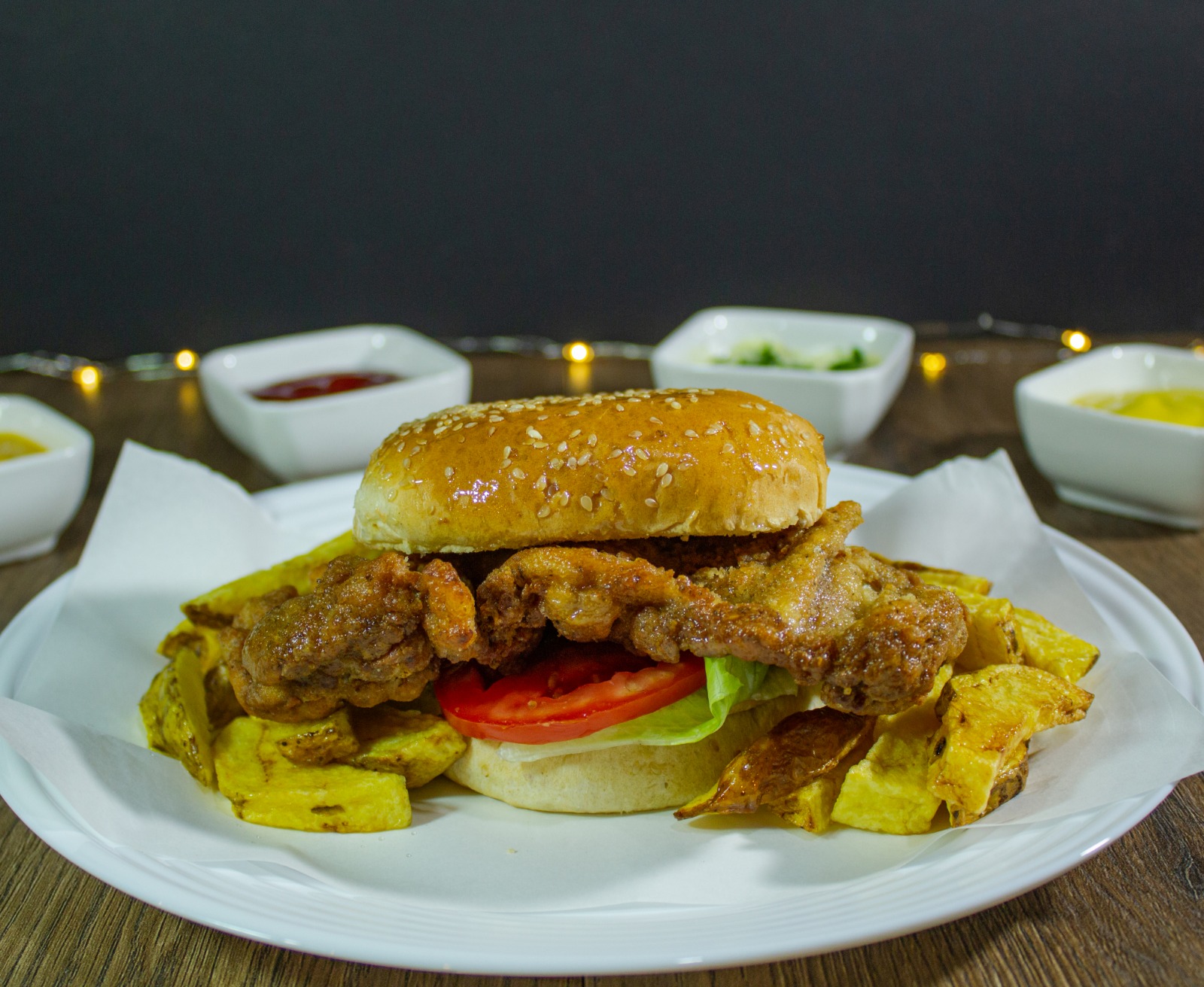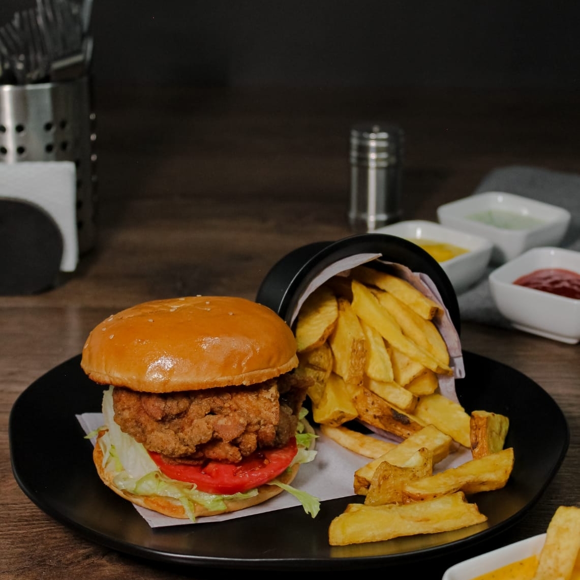 Muslo broaster, cheddar, tocino, lechuga, tomate y papas fritas.