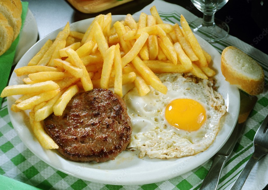 Hot dog de ternera, huevo más papas.