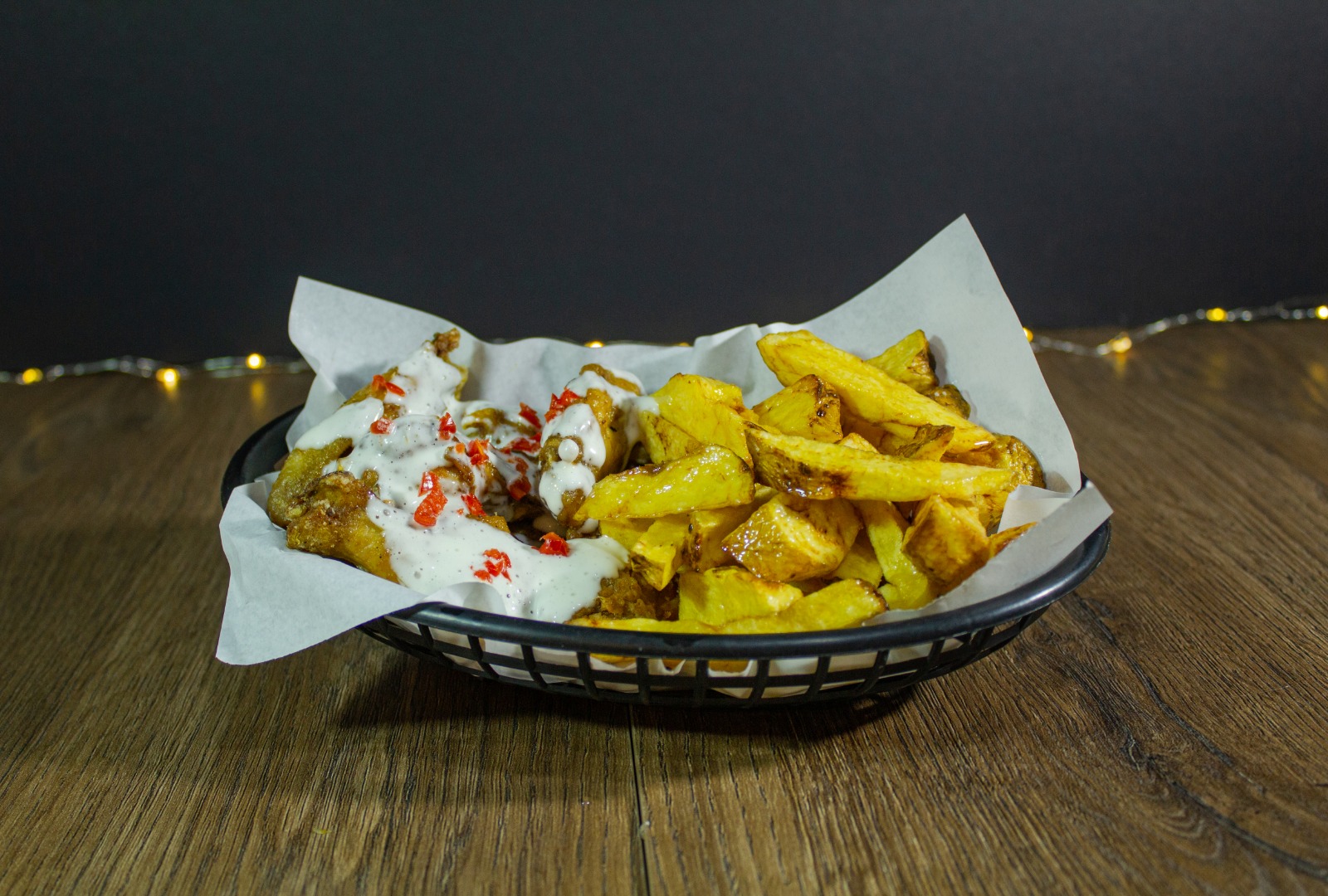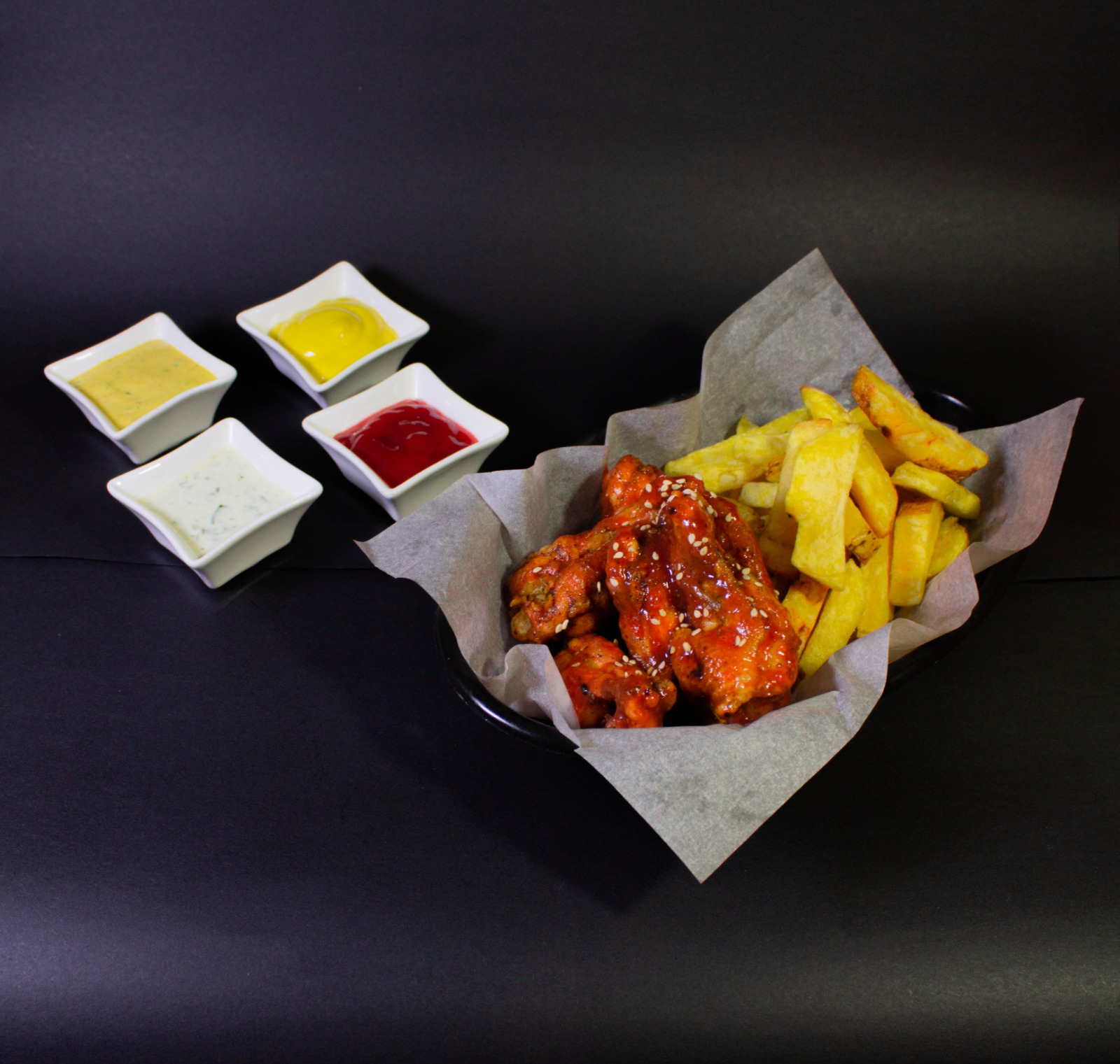 12 Unidades de alitas bañadas en salsa picante más papas fritas.
