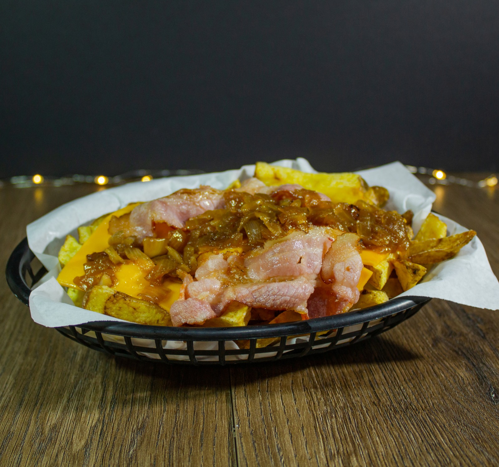 Papas, queso cheddar, tocino más cebolla caramelizada.