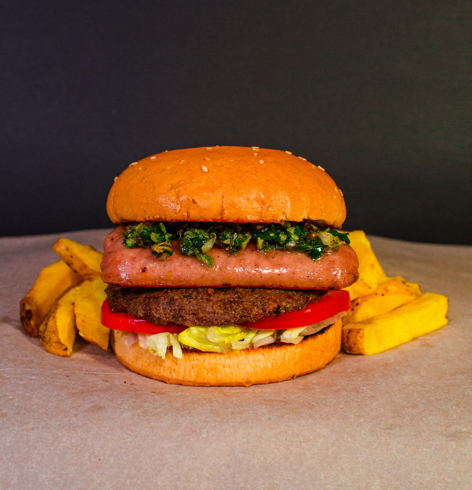 Chorizo, chimichurri, lechuga y tomate.