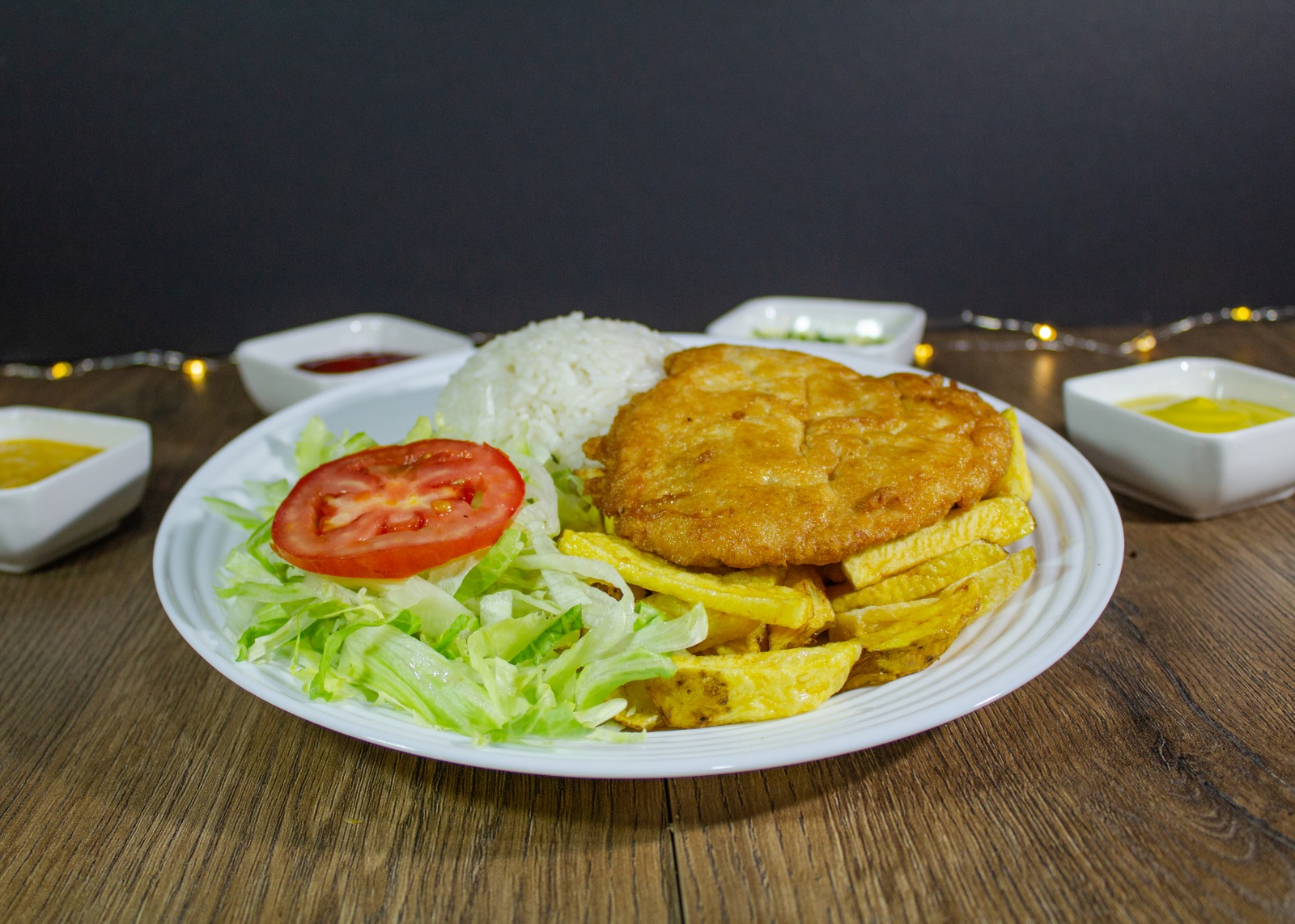 Filete de pechuga, arroz, papas, huevo y plátano.
