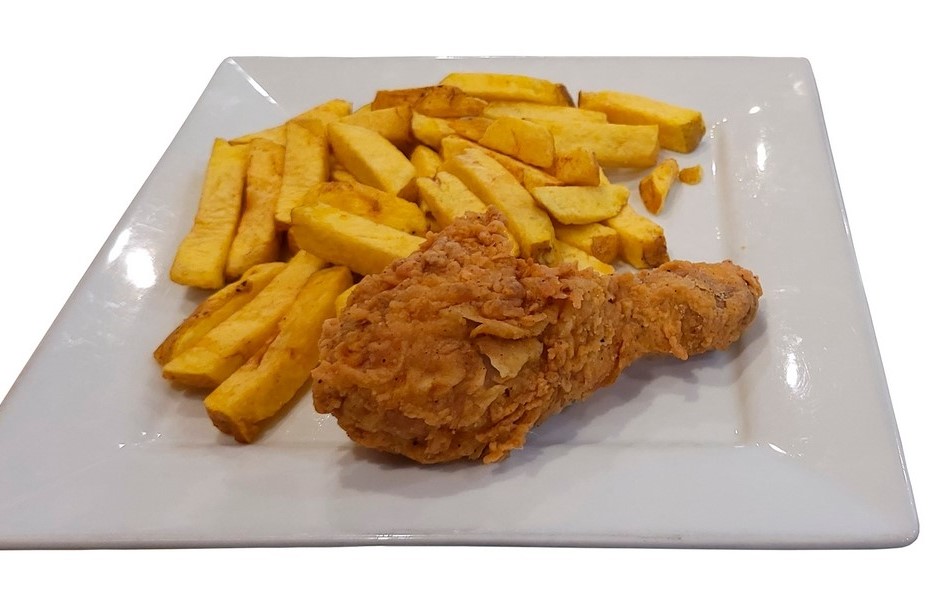 Hot dog de ternera, pierna o muslo broaster deshuesado más papas.