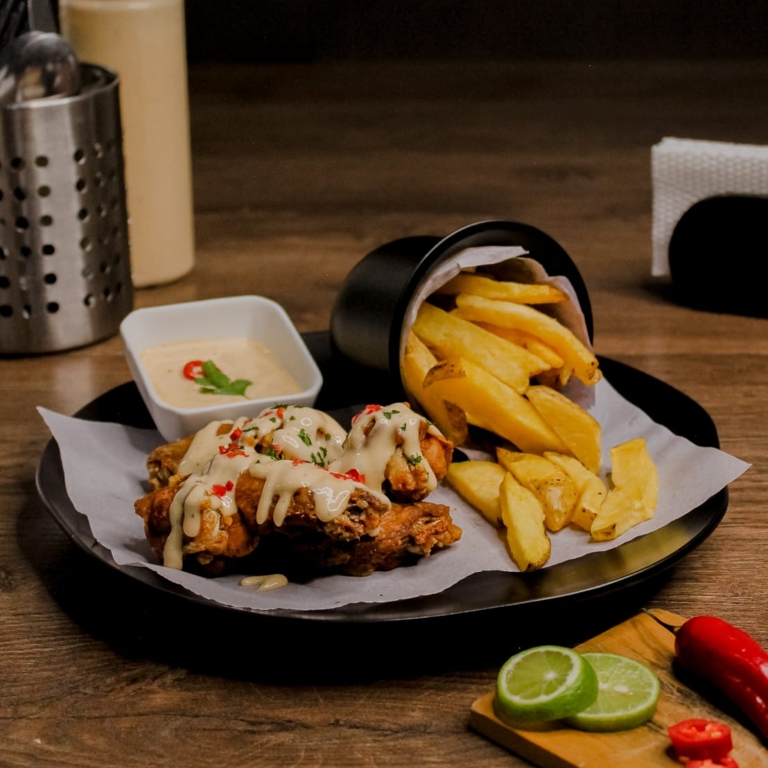 6 Unidades de alitas bañadas en salsa acevichada más papas fritas (ligeramente picada).