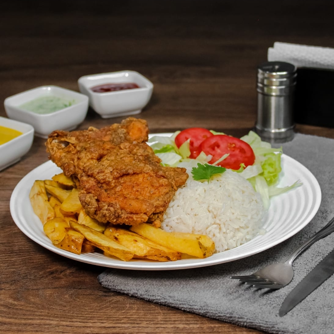 1/4 De pechuga broaster, arroz, papas y ensalada.