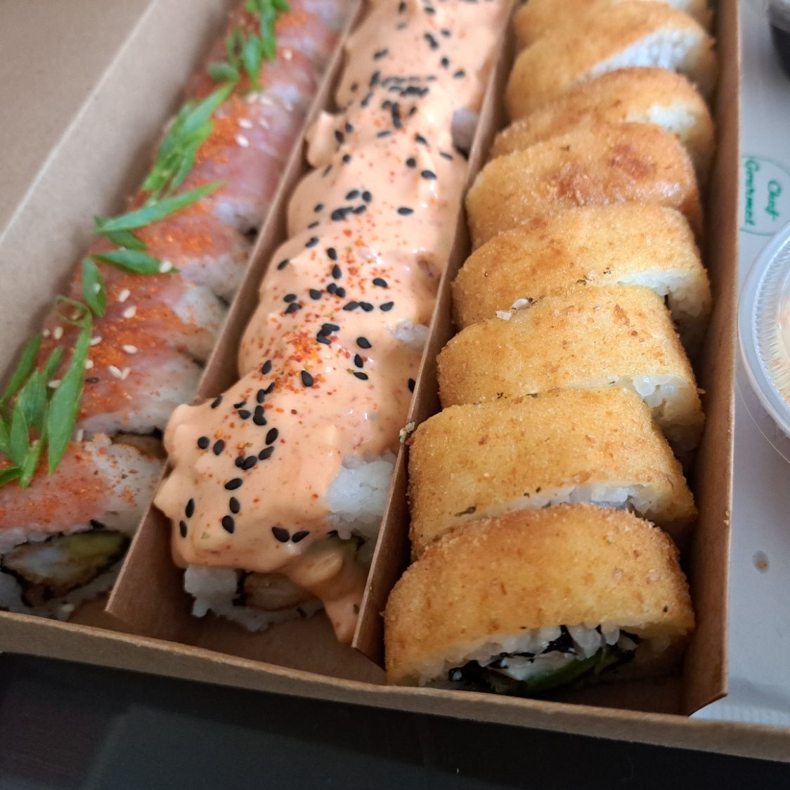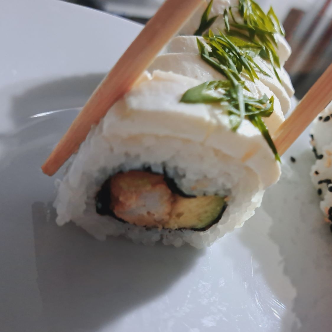 Sushi relleno con palta y langostino tempura, cubierto de dip de queso crema y cebollino.