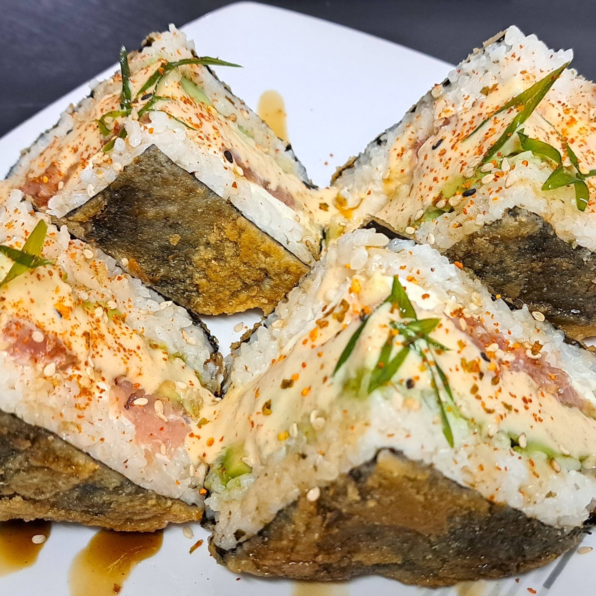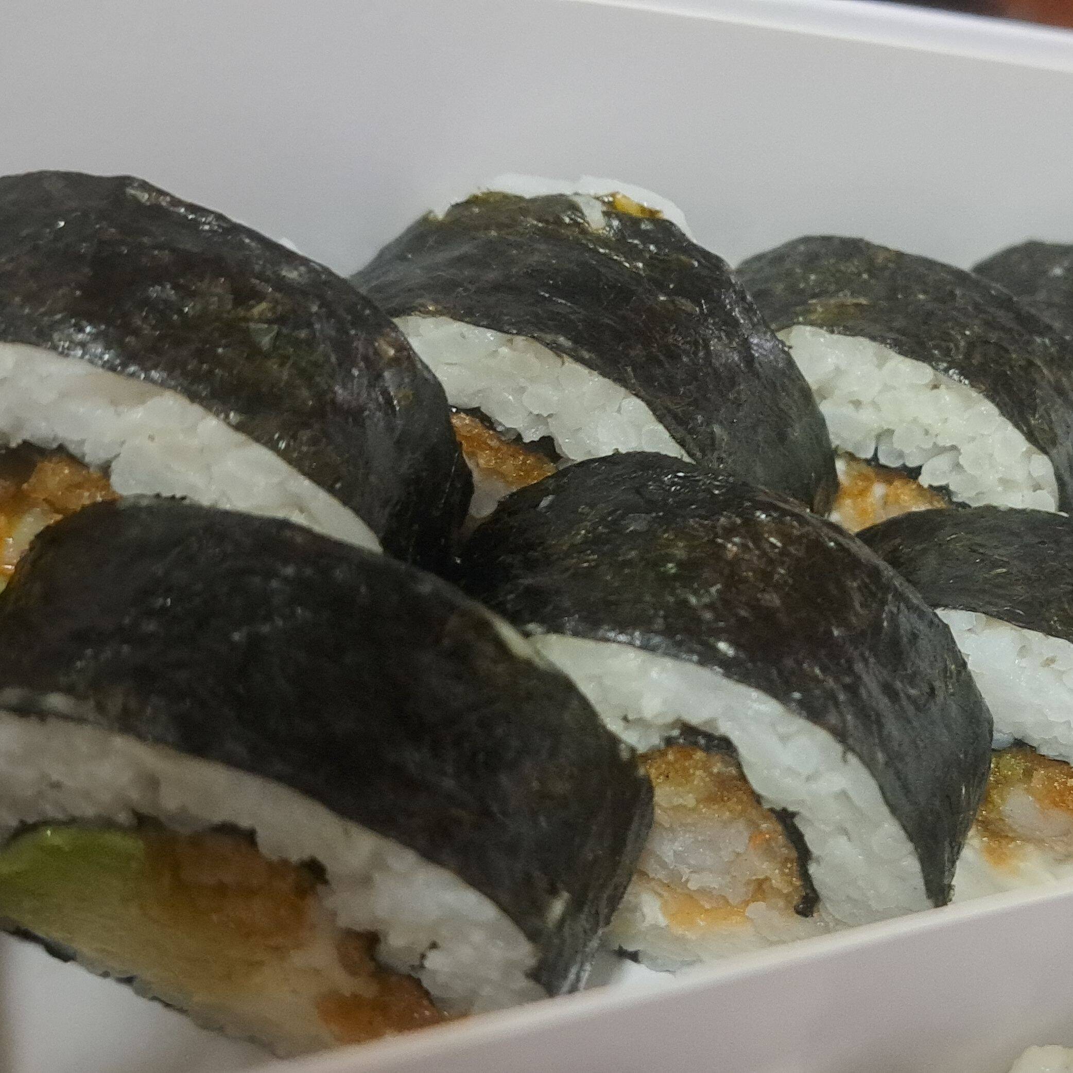 Sushi relleno de palta, queso crema y langostino tempura, envuelto de láminas de nori.