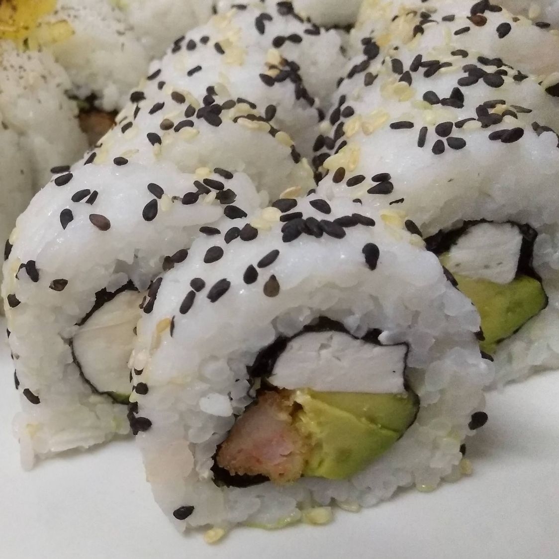 Sushi relleno con palta, queso crema, langostino tempura, cubierto de mix de sésamo negro y blanco.