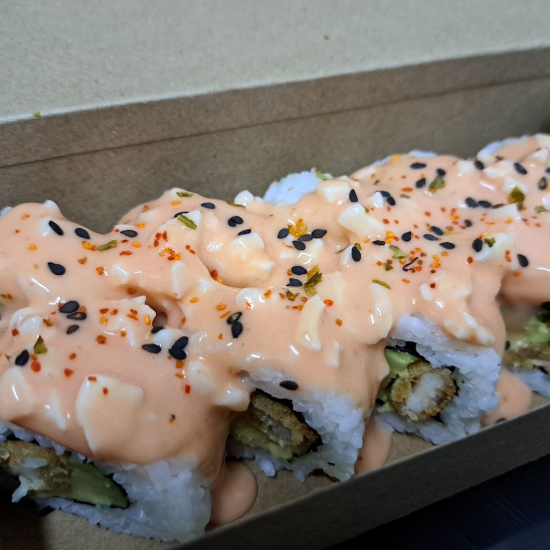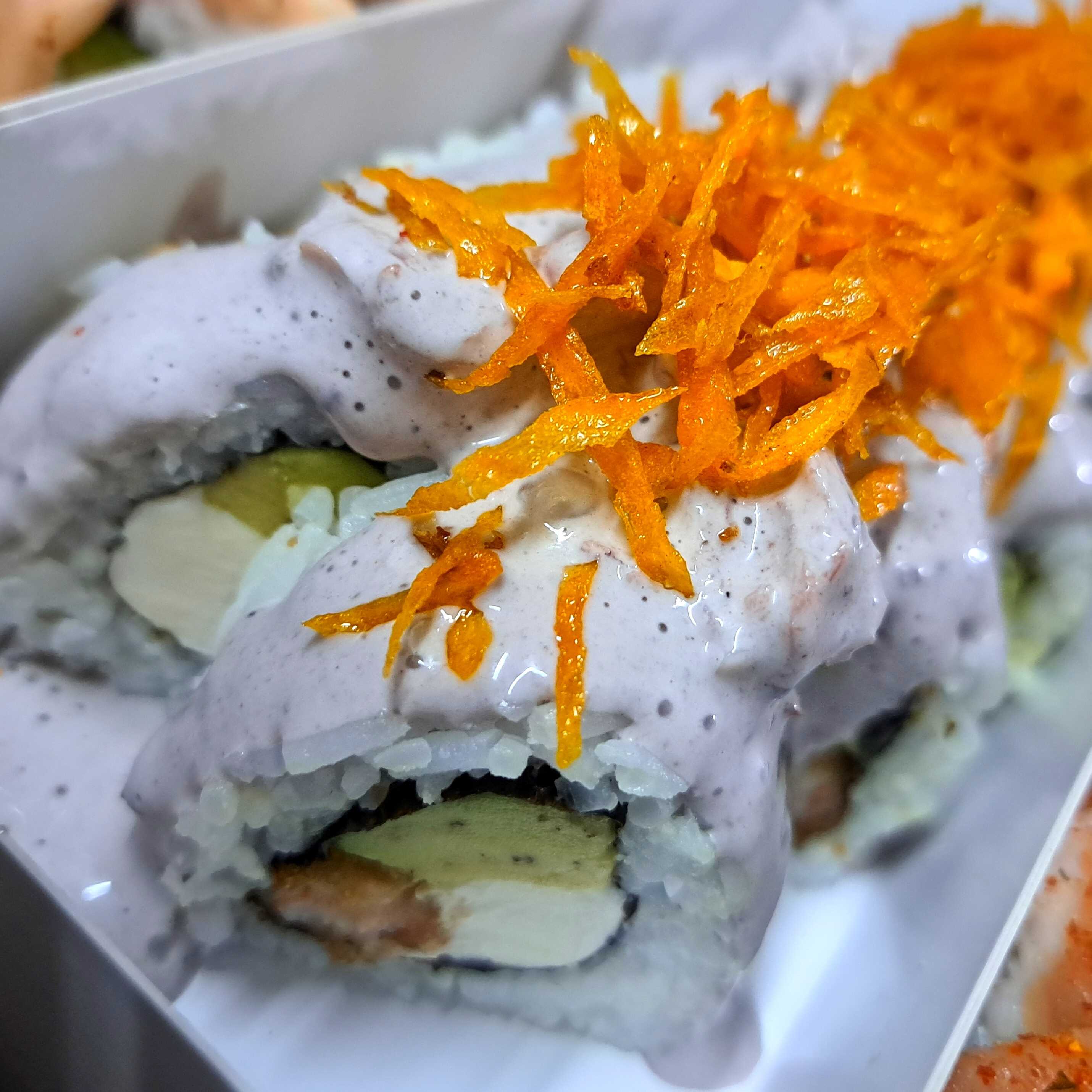 Sushi relleno de palta y langostino tempura, cubierto de mezcla de kanikama de pulpa de cangrejo, salsa picante y sésamo negro.