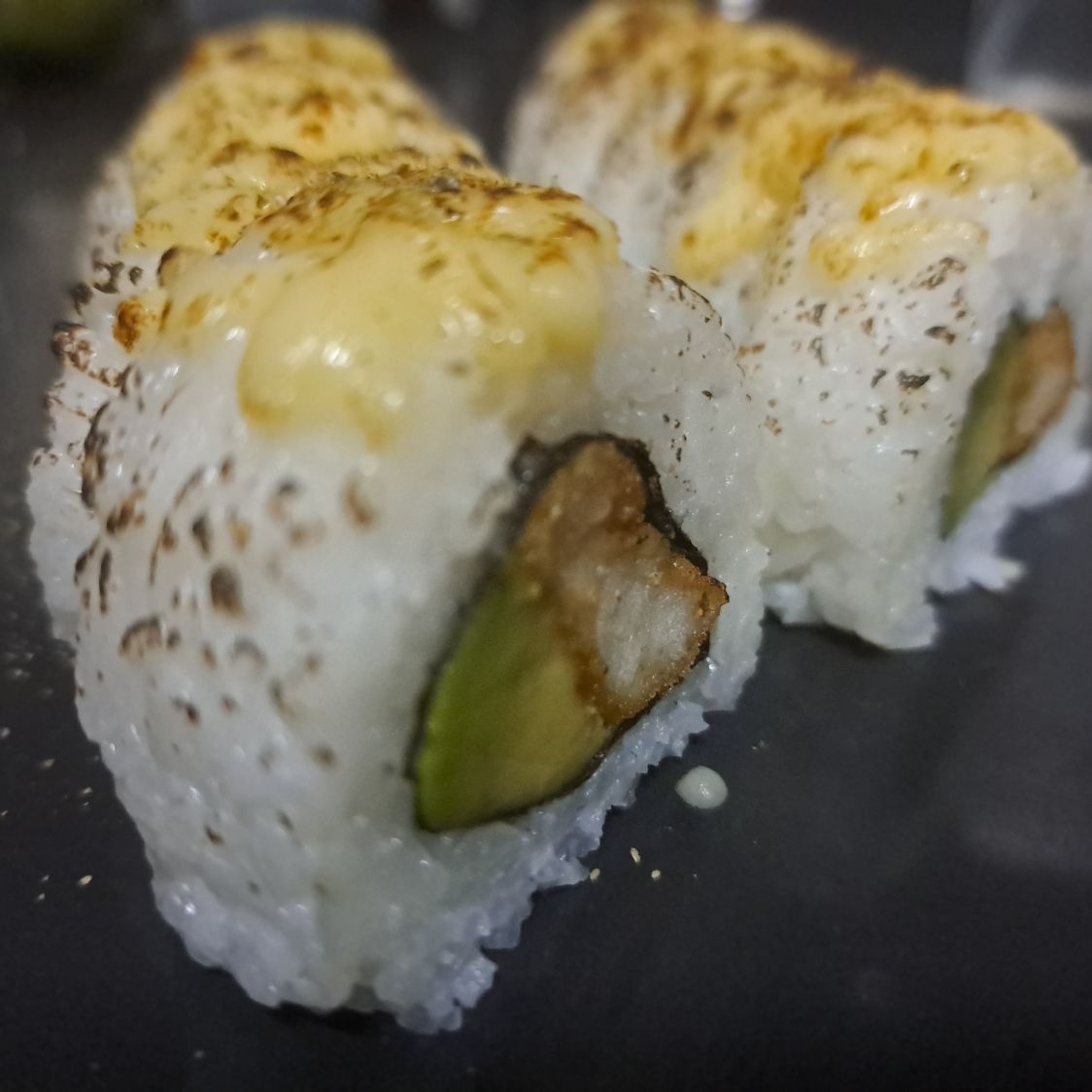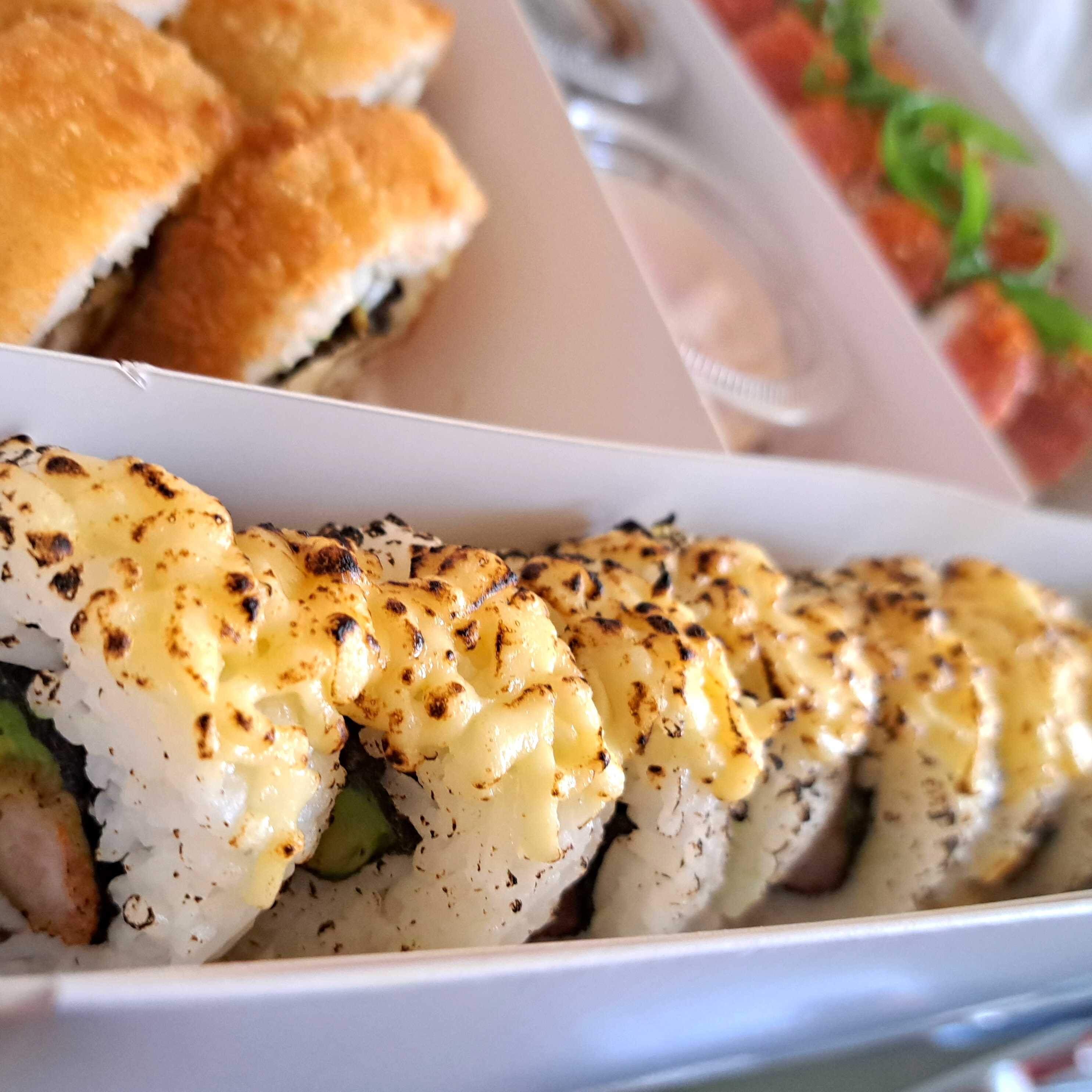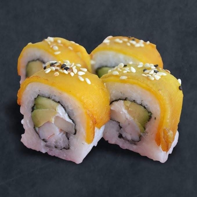 Sushi relleno de palta y langostino tempura, cubierto de queso parmesano flameado y orégano en polvo.