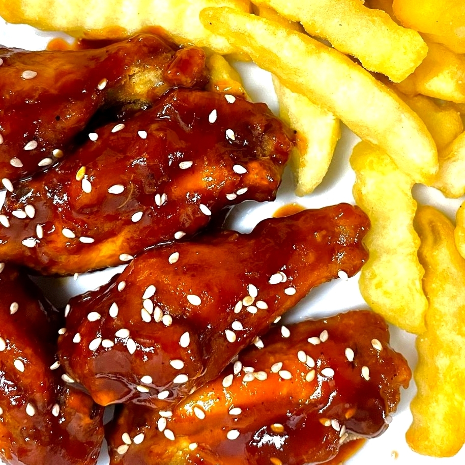6 Uds de alitas + papas + 2 salsas favoritas