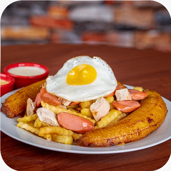 Carne de res, jamón, queso, huevo, papas, ensalada, cremas.