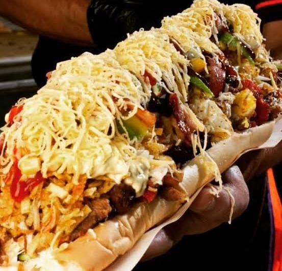 Pan baguette, carne y pollo trozos, chorizo, maíz,jamón, queso, huevo, aguacate, tocino, papas fritas o al hilo.