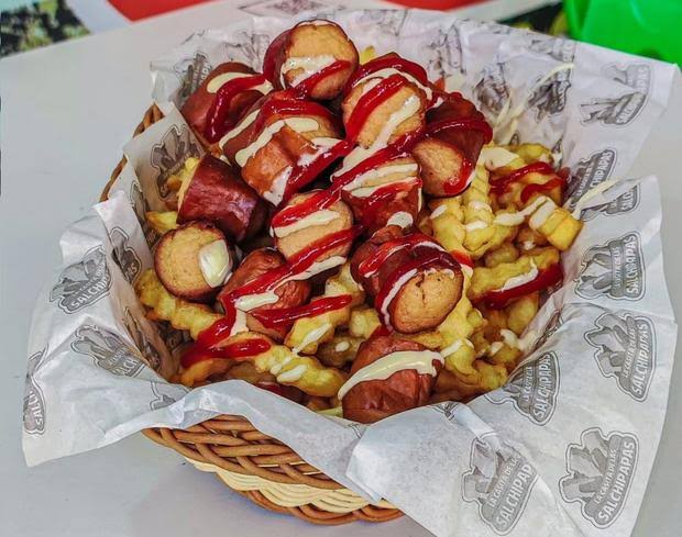 Papas fritas, hot dog, frankfurt, chorizo, pollo en trozos, maíz, queso fundido, huevo.