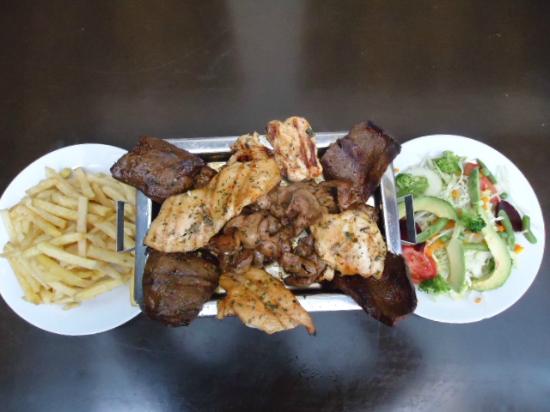 Carne y pollo en trozos, ensalada, papás fritas.