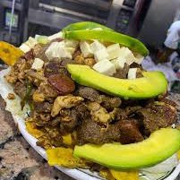 Tortilla carne y pollo en trozos, jamón, queso, tocino, maíz, aguacate, papas fritas o al hilo.