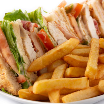 Pan molde, filete de pollo, ensalada de lechuga y tomate, papas fritas, jamón, queso fundido, focino, huevo.