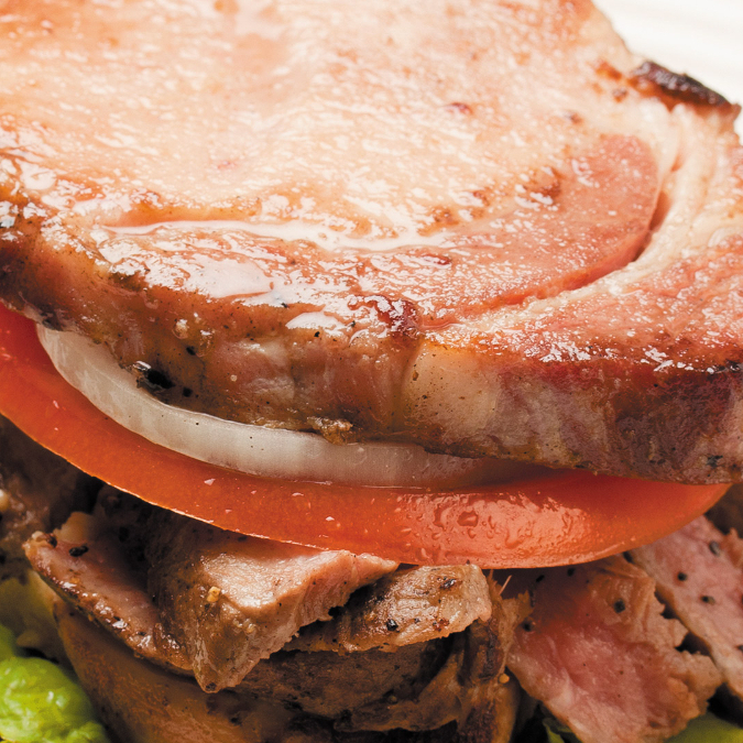 Hamburguesa de chuleta ahumada, lechuga, tomate, jamón, huevo, papas fritas o al hilo.