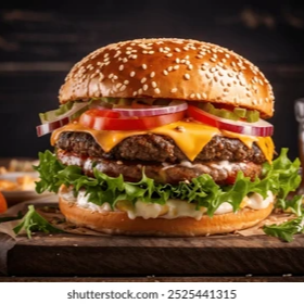 Hamburguesa de doble carne o doble filete, lechuga, tomate, jamón, queso fundido, papas fritas o al hilo.