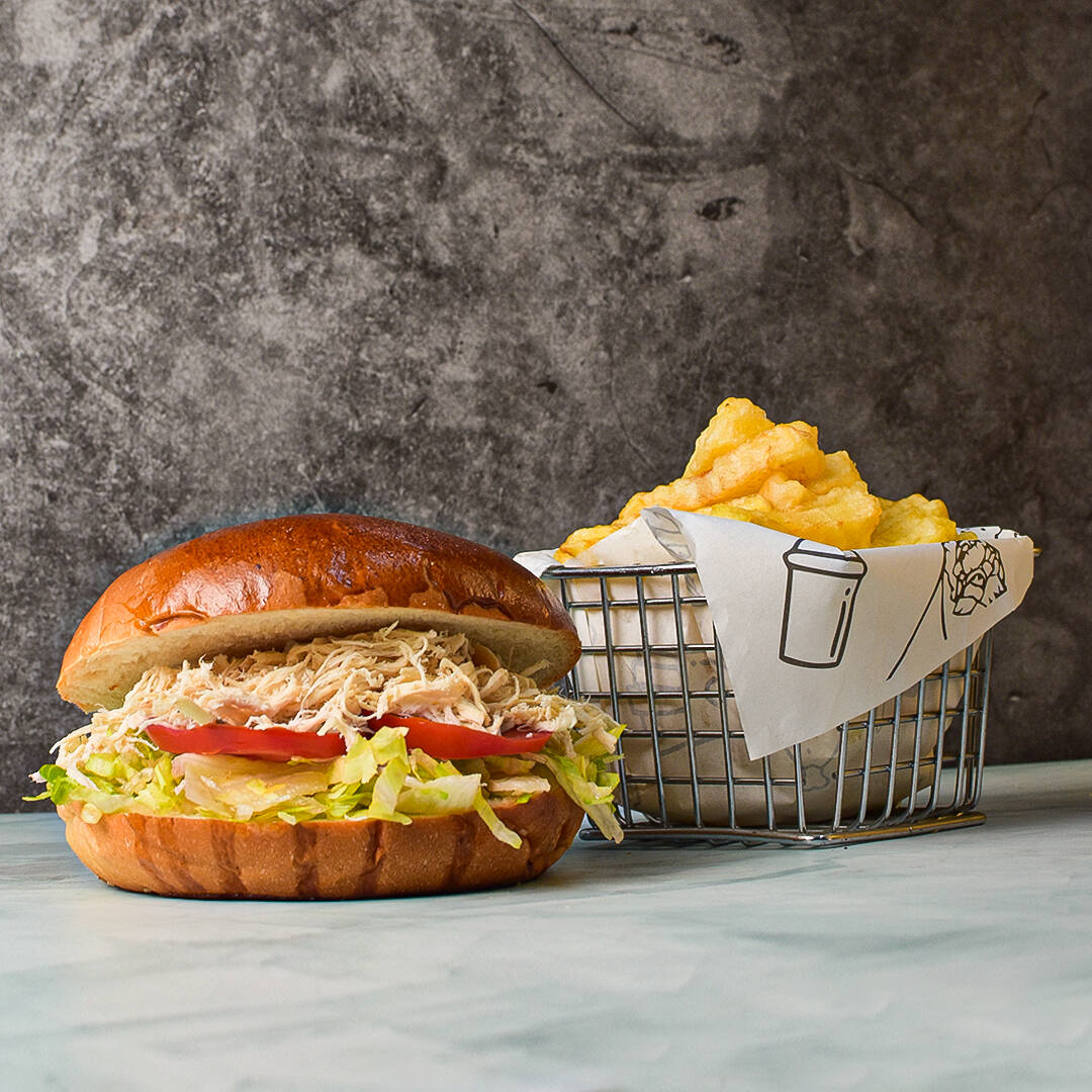 Pechuga Crispy En Salsa BBQ + Pickles + Coleslaw + Papas Al Hilo