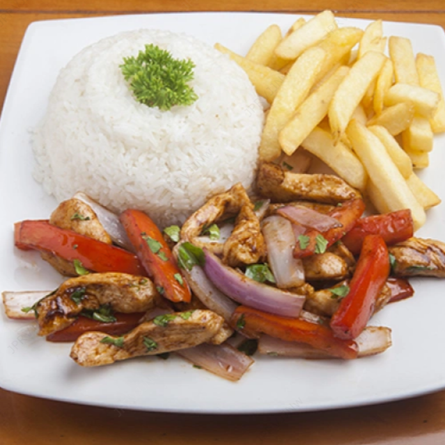 lomo saltado de pollo acompañada con papas fritas y arroz blanco.