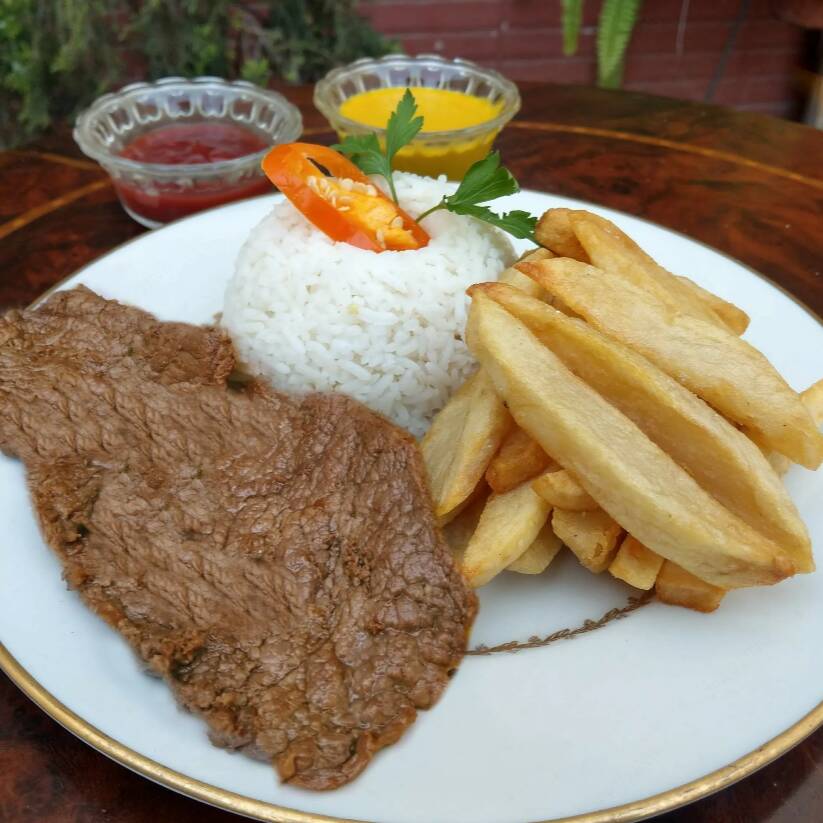 Lomo saltado de carne acompañada con papas fritas y arroz blanco.