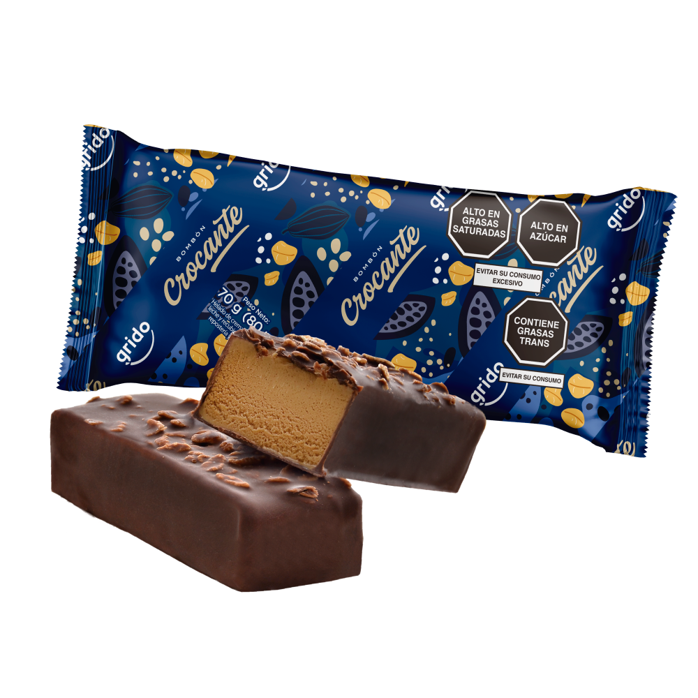 Bombón con crema helada de dulce de leche, chocolate, leche entera y cereal inflado.