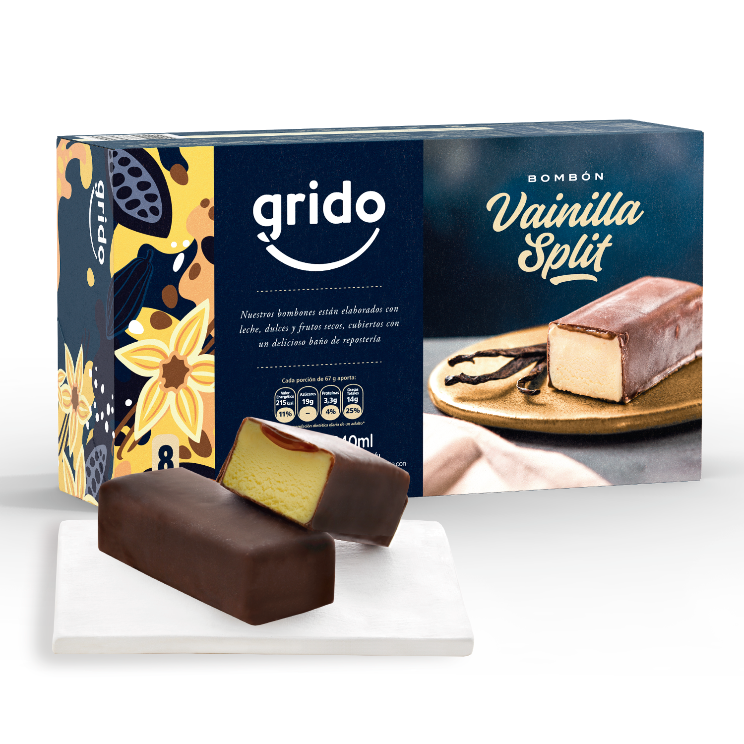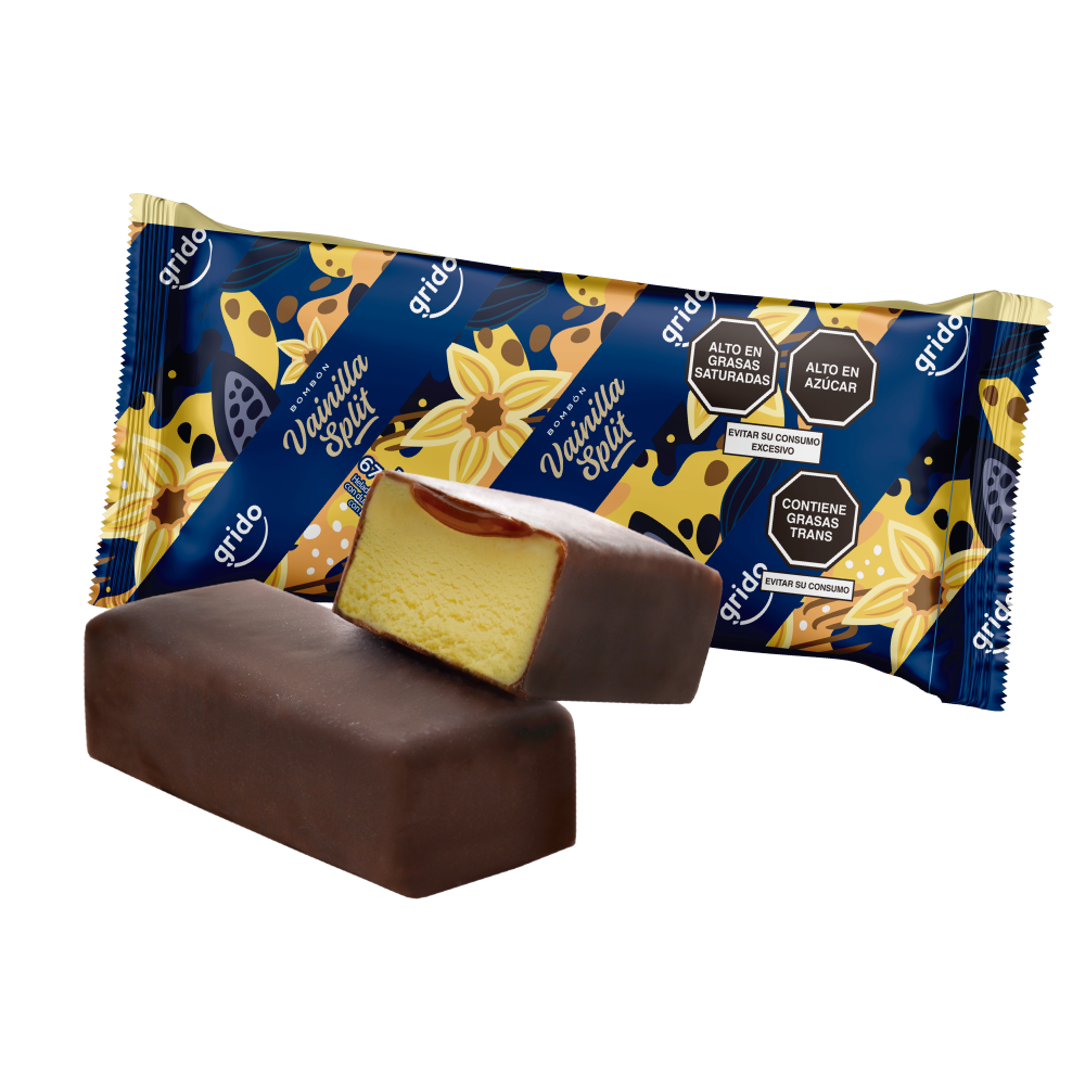 Bombón con crema helada de vainilla, dulce de leche, capa de chocolate y leche entera, 8 pz.