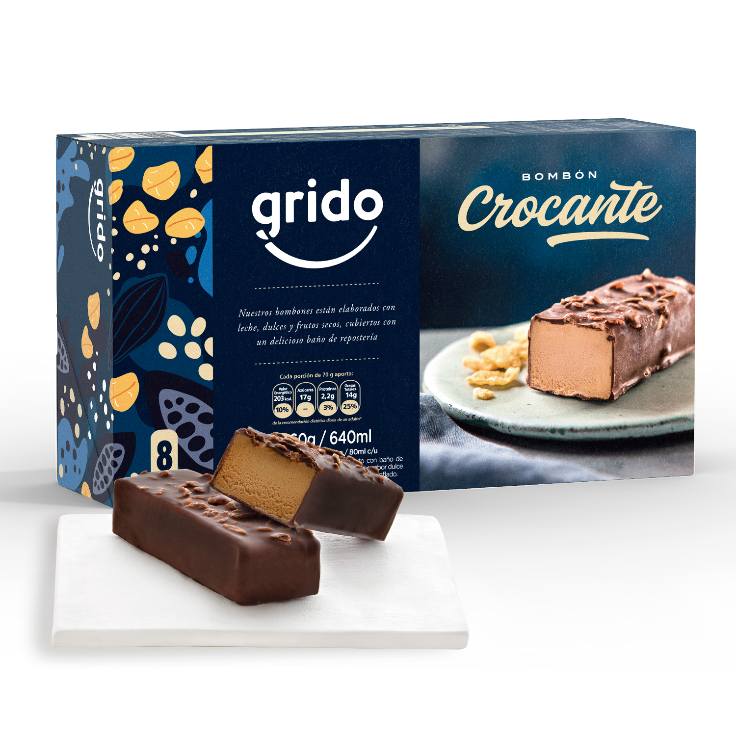 Bombón con crema helada de dulce de leche, chocolate, leche entera y cereal inflado, 8 pz.