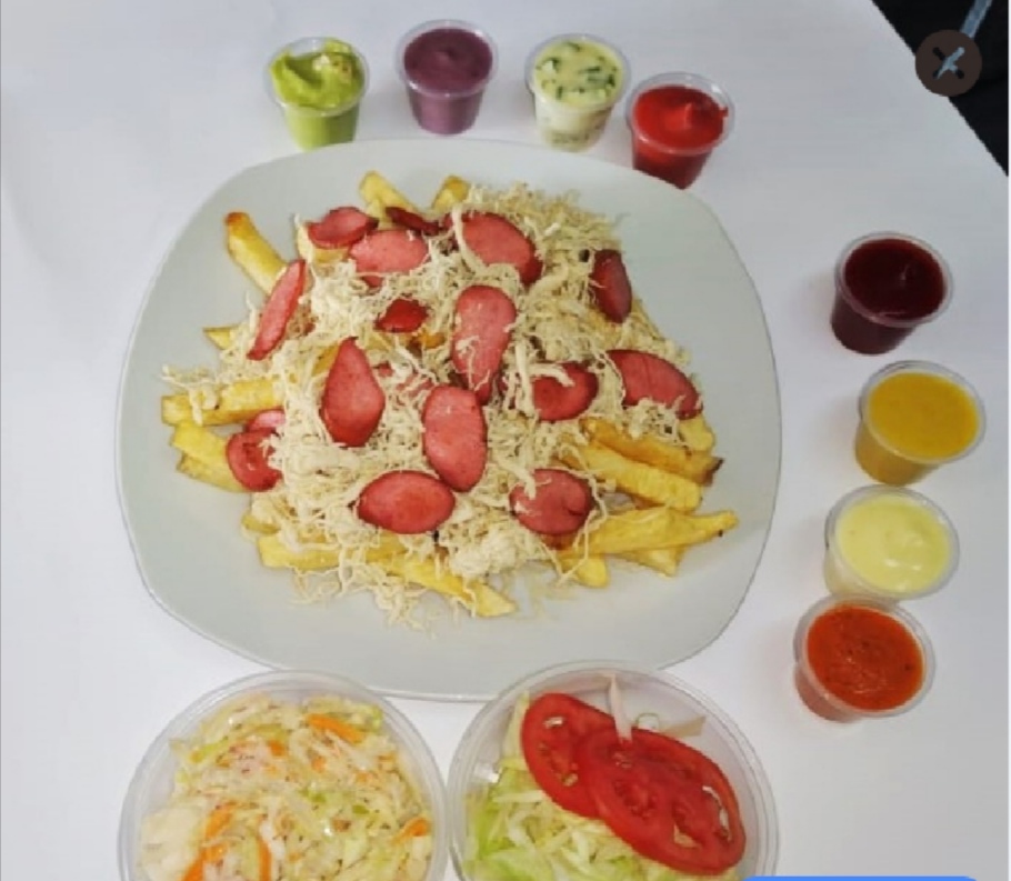 Papas, hot dog, queso, tocino, huevo y cremas a elección.
