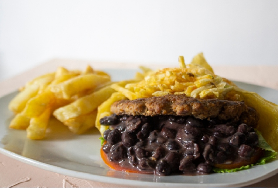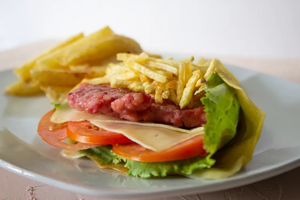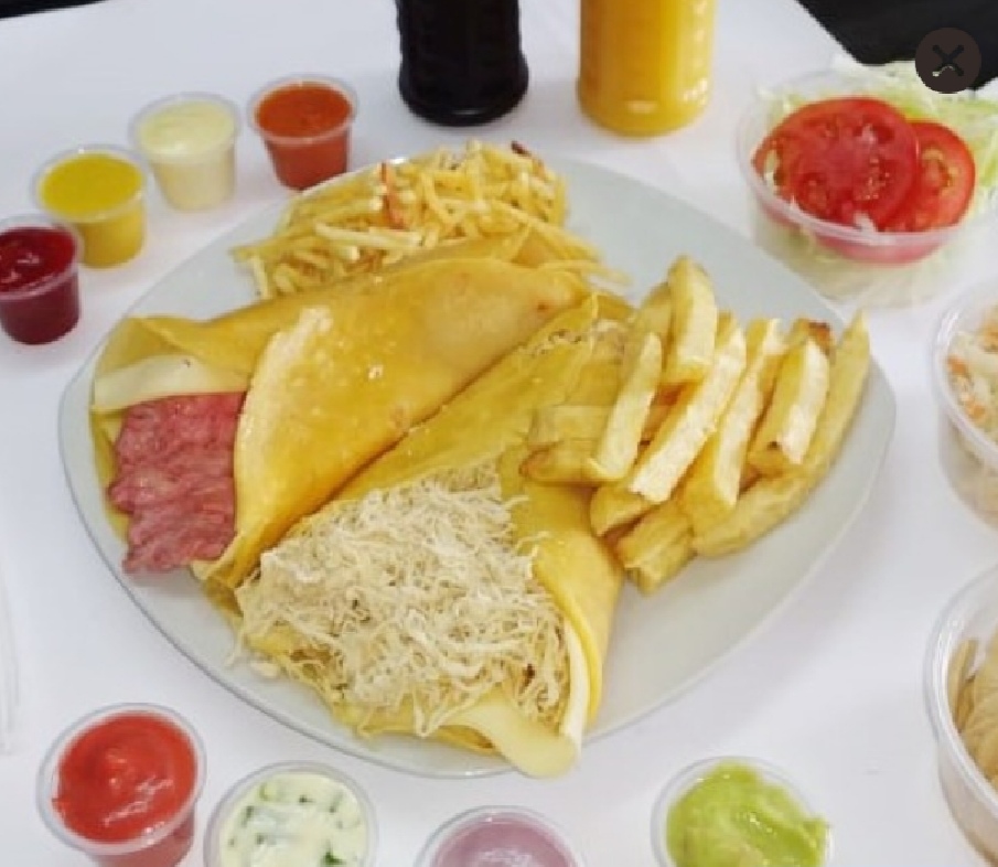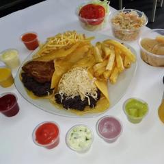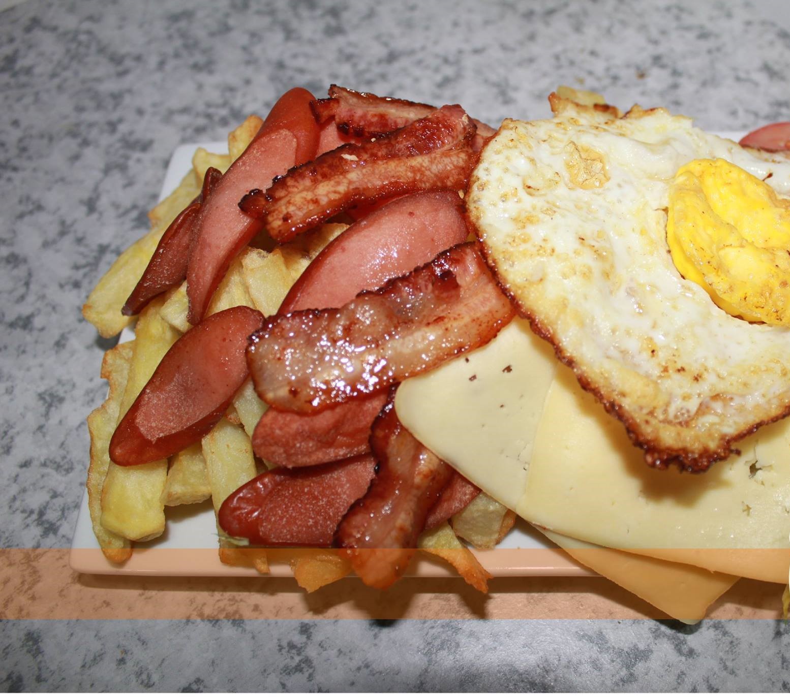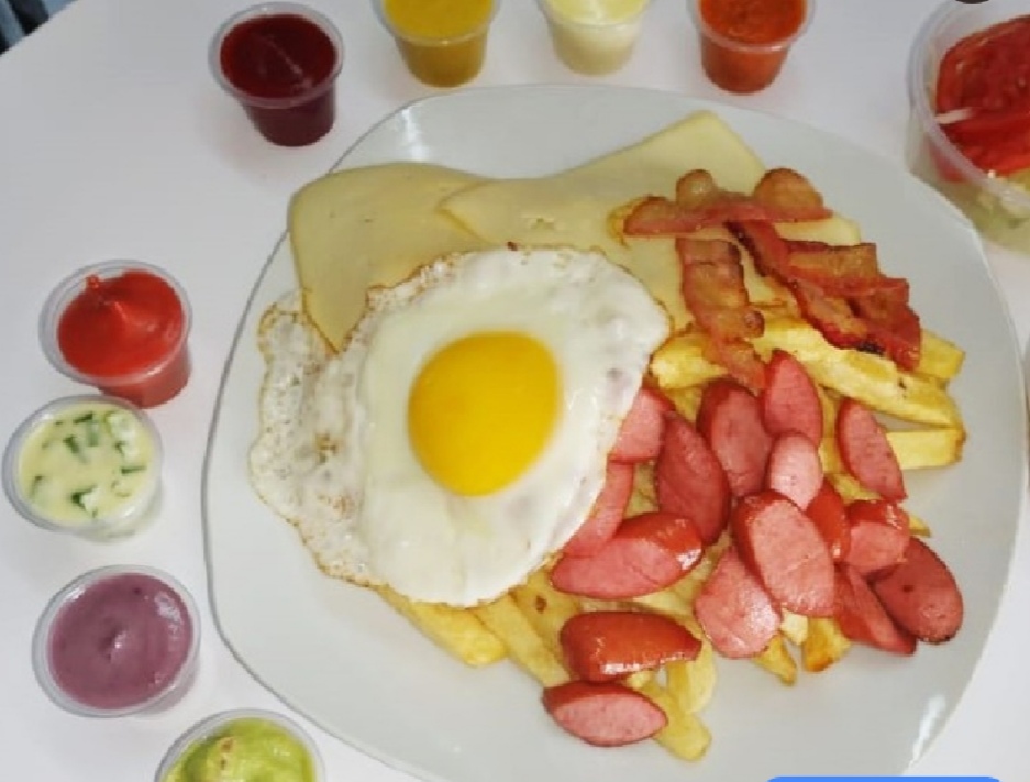 Papas fritas, huevo, hot dog, plátano frito, cremas, ensalada y bebida a elección.