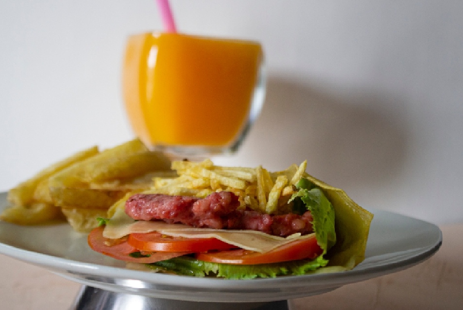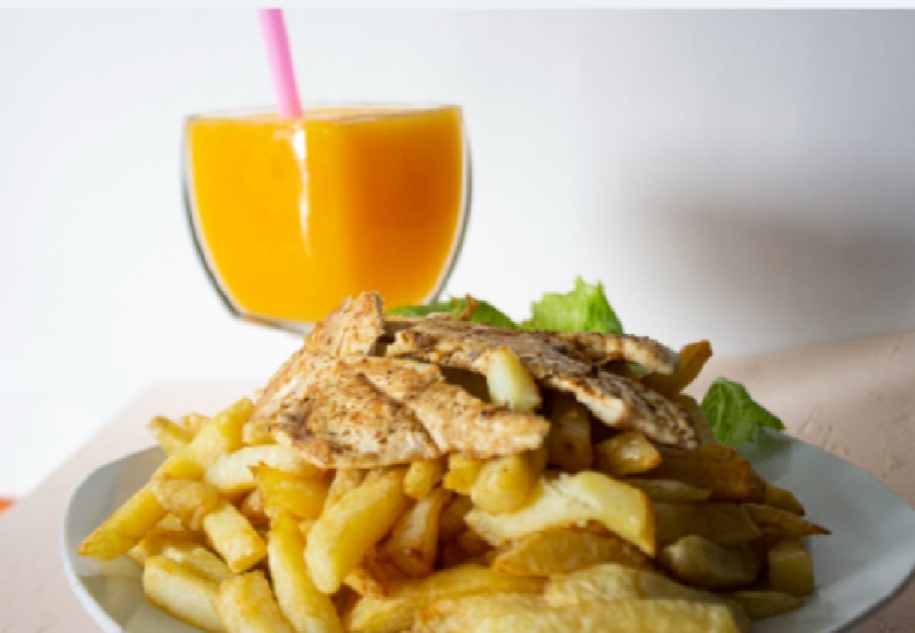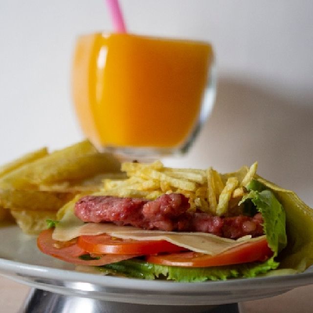 Filete al plato, papas fritas, ensalada y jugo a elección